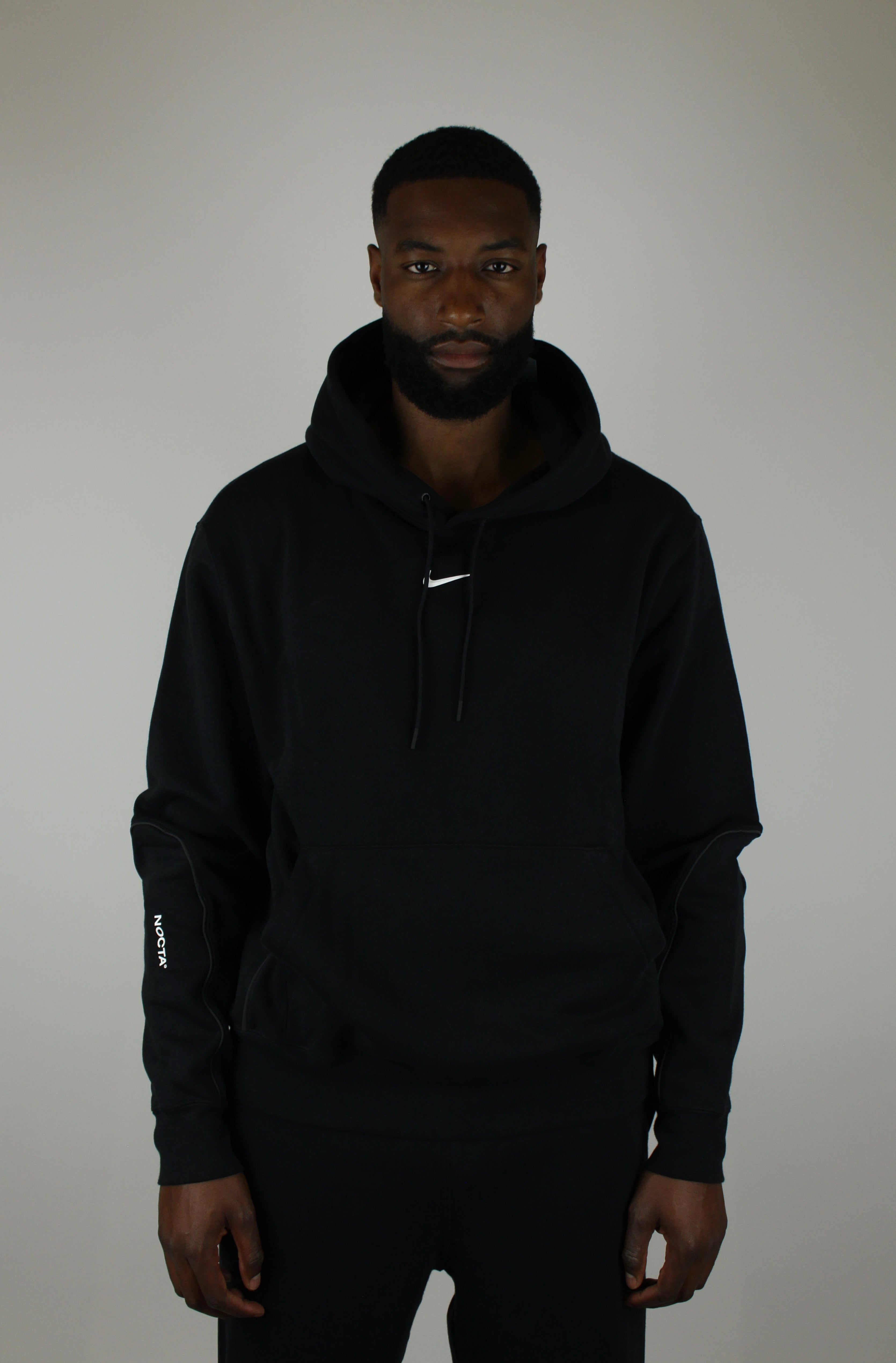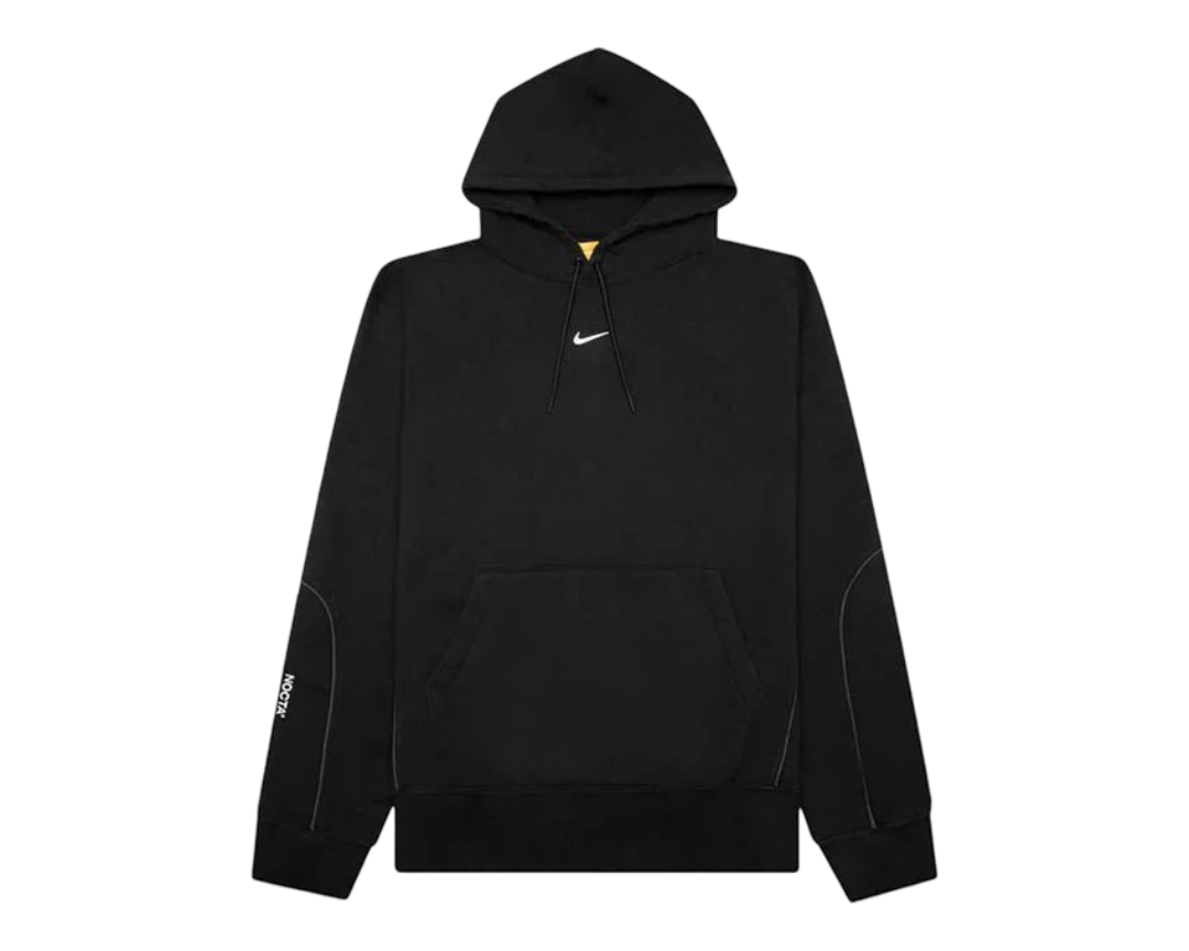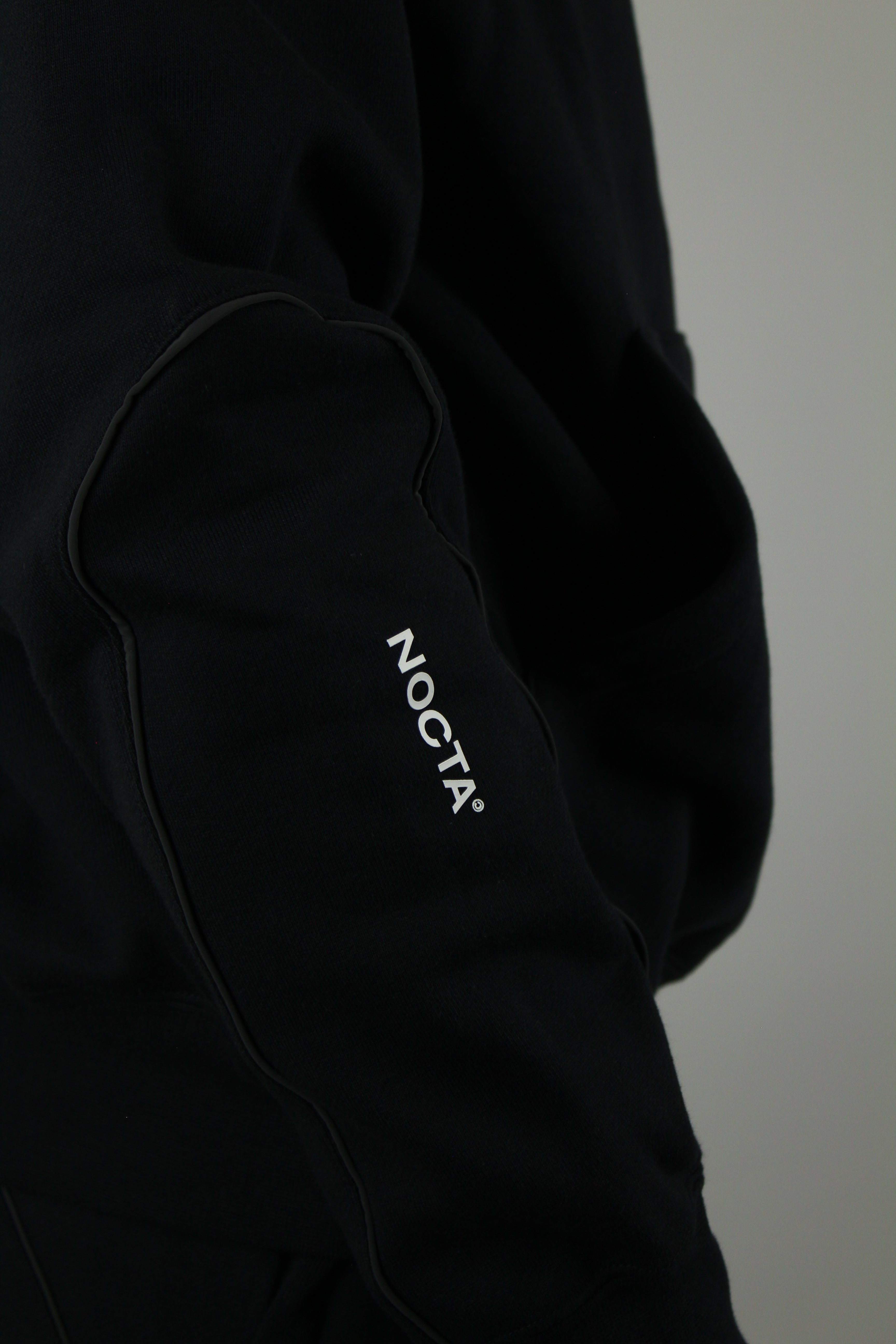 The deep black colorway provides a versatile base, easily pairing with various bottoms from jeans to joggers. Design features include a classic pullover style, a spacious hood for added protection, and ribbed cuffs and hem for a snug fit. Subtle yet distinctive co-branding, including the NOCTA logo, adds an exclusive touch to the hoodie, marking its unique collaboration origins.
