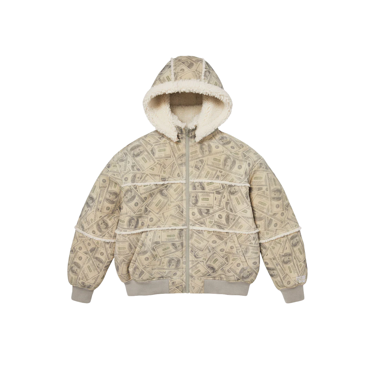 Supreme x MM6 Maison Margiela Hooded Shearling Bomber Jacket White merges high fashion deconstruction with iconic streetwear energy. Crafted from premium shearling, this jacket delivers exceptional warmth and a luxurious textured finish. The clean white colourway enhances the bold silhouette, while signature MM6 Maison Margiela detailing and Supreme branding create a distinctive collaborative identity. Featuring a hooded construction and relaxed bomber fit, this piece stands out as a statement outerwear item within contemporary fashion.