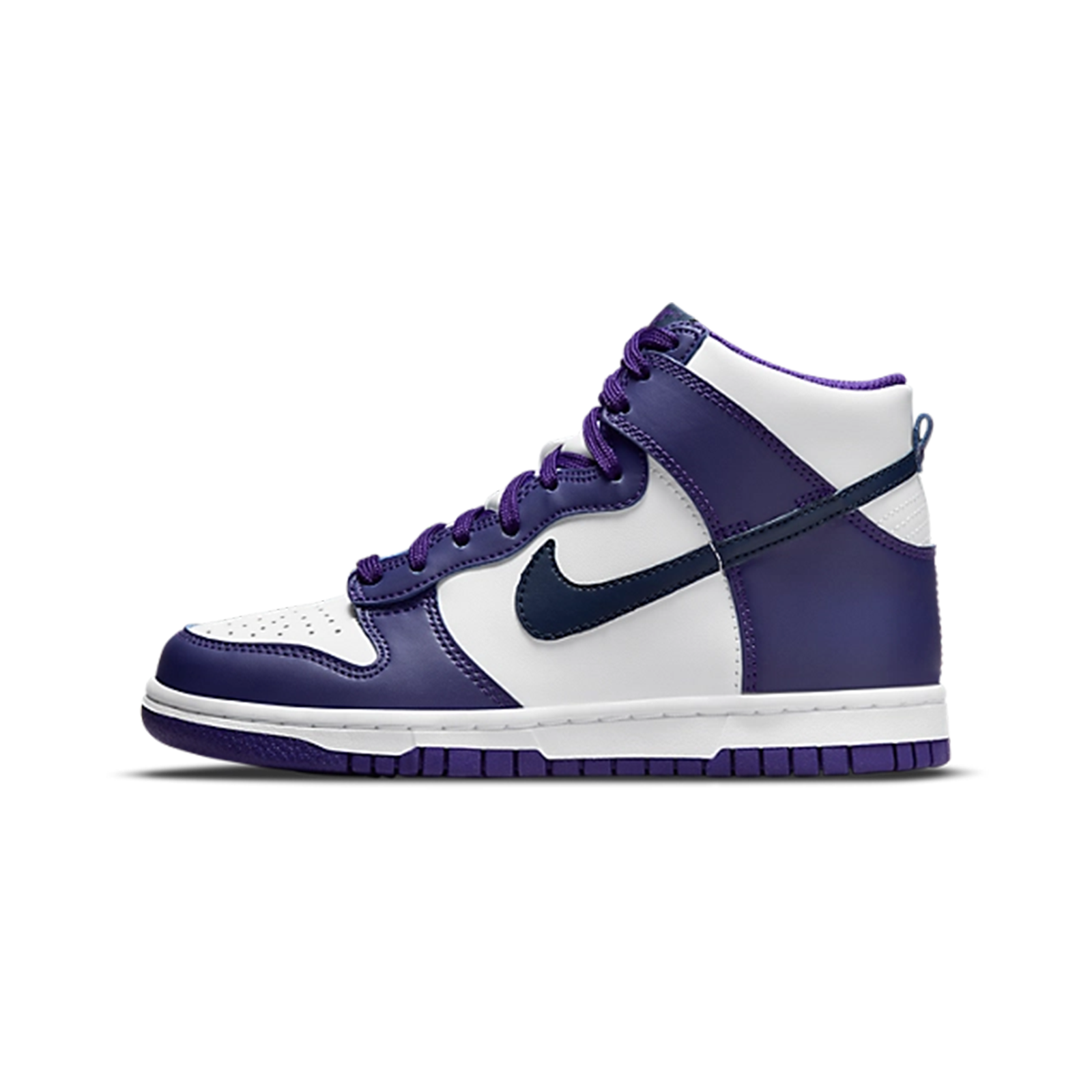 The Nike Dunk High 'Electro Purple Midnight Navy' features a premium leather upper in a striking mix of Electro Purple and Midnight Navy tones. The base is dressed in clean white, allowing the bold purple overlays and navy Swooshes to pop. Matching navy laces and inner lining add depth to the design, while the classic white midsole and purple outsole complete the look. Finished with traditional Nike branding on the tongue and heel, this Dunk High delivers standout color blocking with timeless hoops heritage.