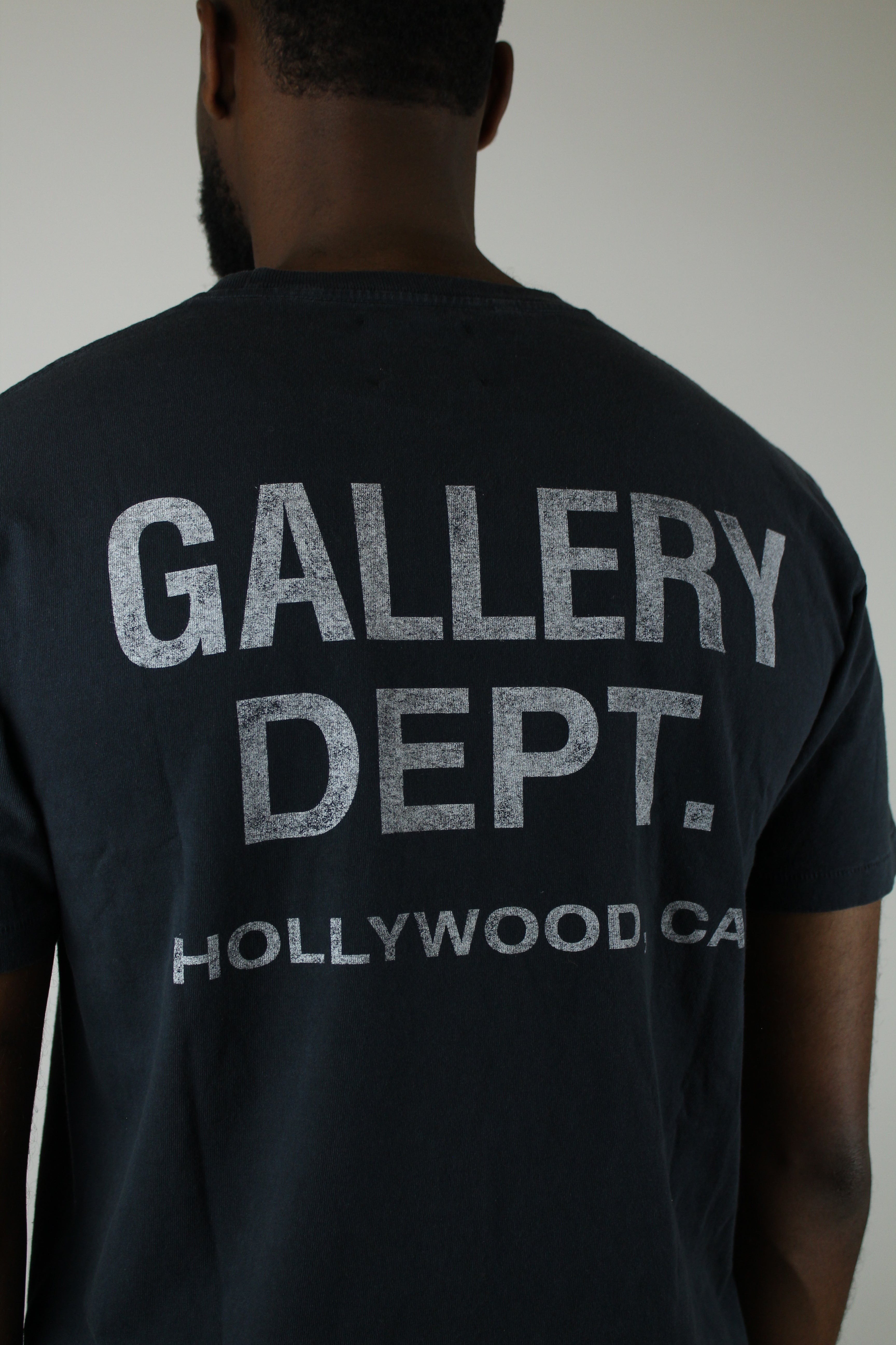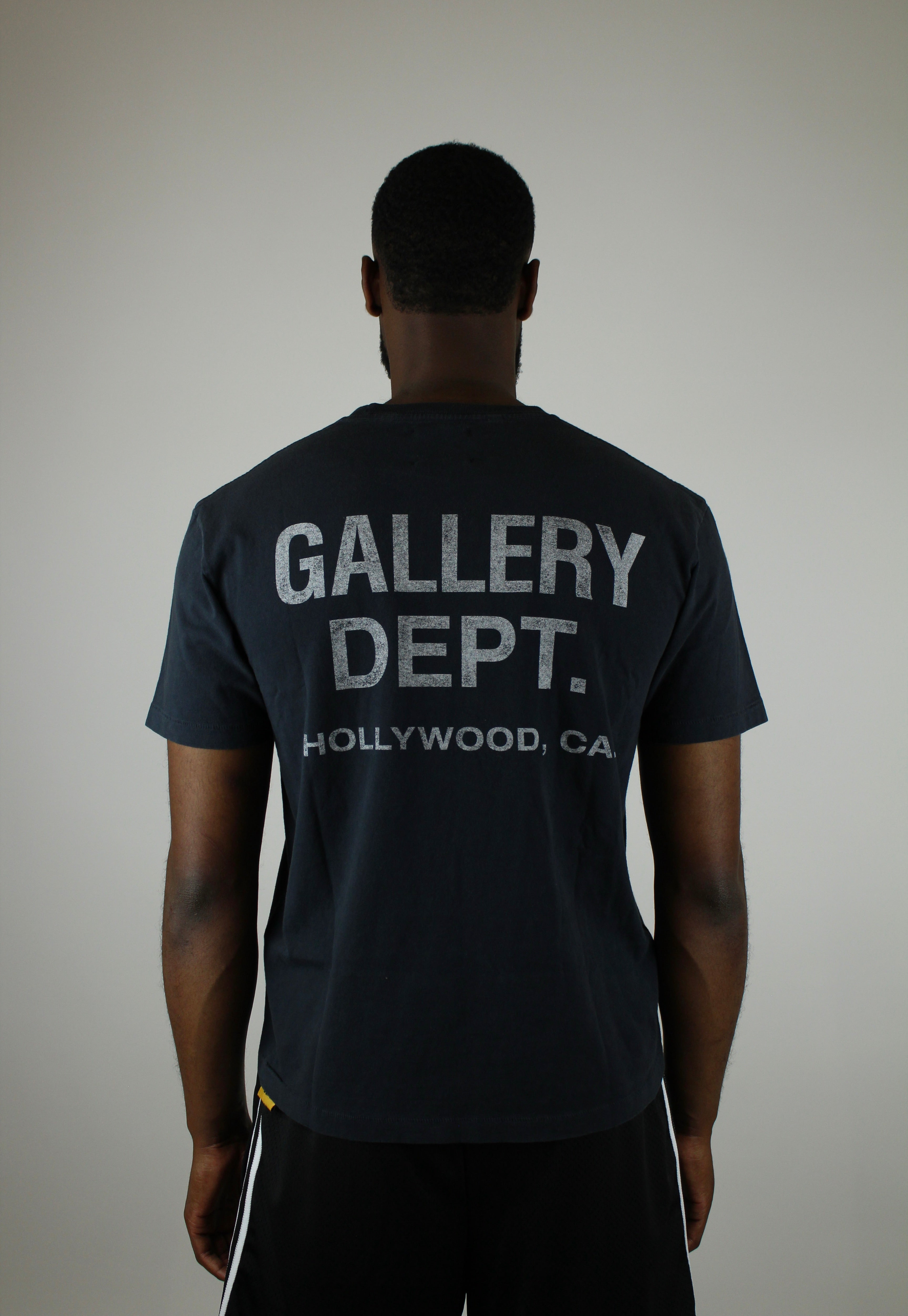 Das T-Shirt hat einen Rundhalsausschnitt und einen kastig geschnittenen Schnitt. Es ist leicht, robust und bequem, da es aus reiner, echter Baumwolle besteht. Der Schriftzug „Gallery Dept.“ ist auf der Vorderseite, direkt unter der Brust, und auf der Rückseite des verwaschenen schwarzen Shirts in Weiß im Siebdruckverfahren aufgedruckt.