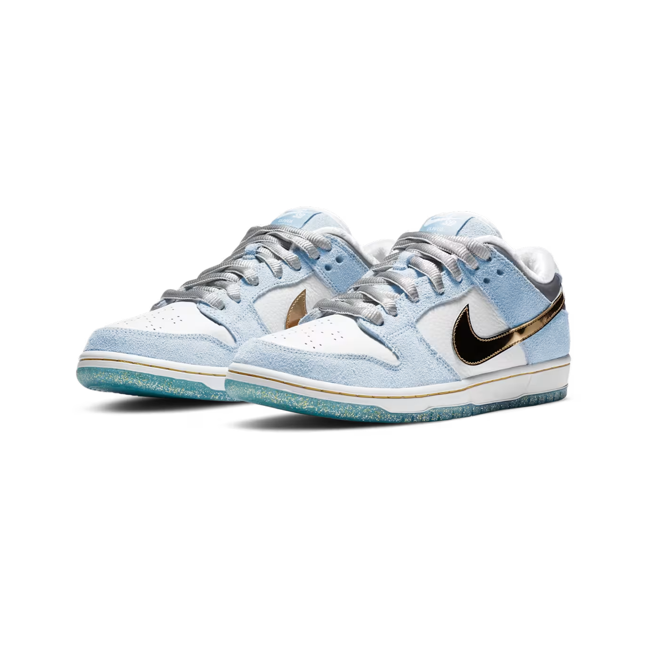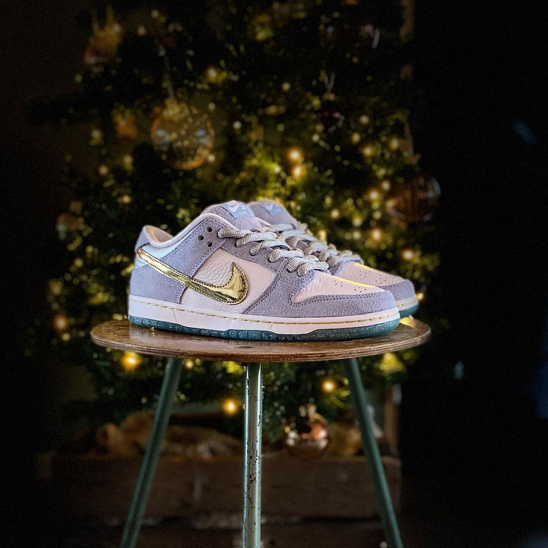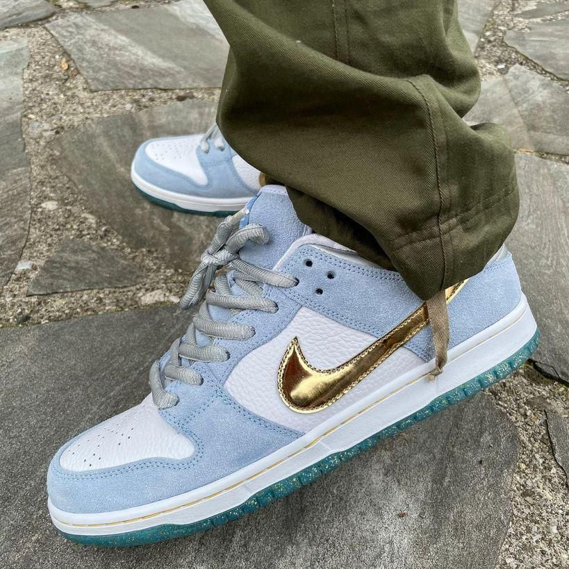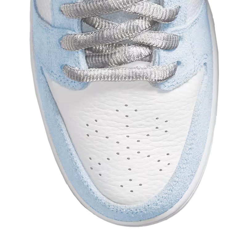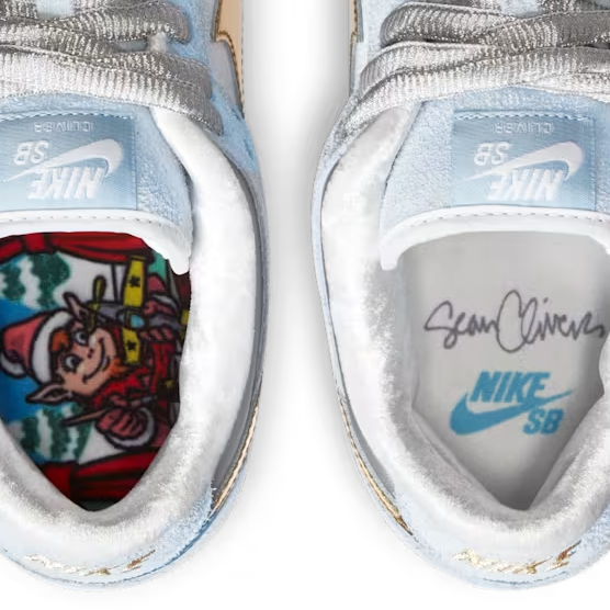 Nike SB Dunk Low Sean Cliver (Style DC9936-100) ist eine der begehrtesten und sammelwürdigsten SB Veröffentlichungen der letzten Jahre. Der Sneaker wurde vom Künstler und Skate Ikone Sean Cliver entworfen und trägt seine unverwechselbare Handschrift in Form von winterlichen Farben und kreativen Details. Hellblaues Wildleder, weißes Leder und metallisch goldene Akzente erzeugen einen hochwertigen Look, ergänzt durch eine glitzernde Midsole und eine Innensohle mit typischen Cliver Illustrationen.