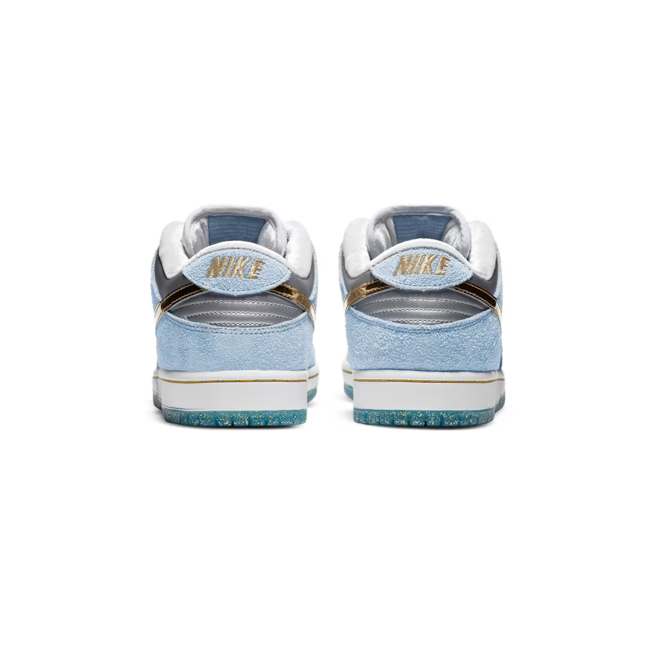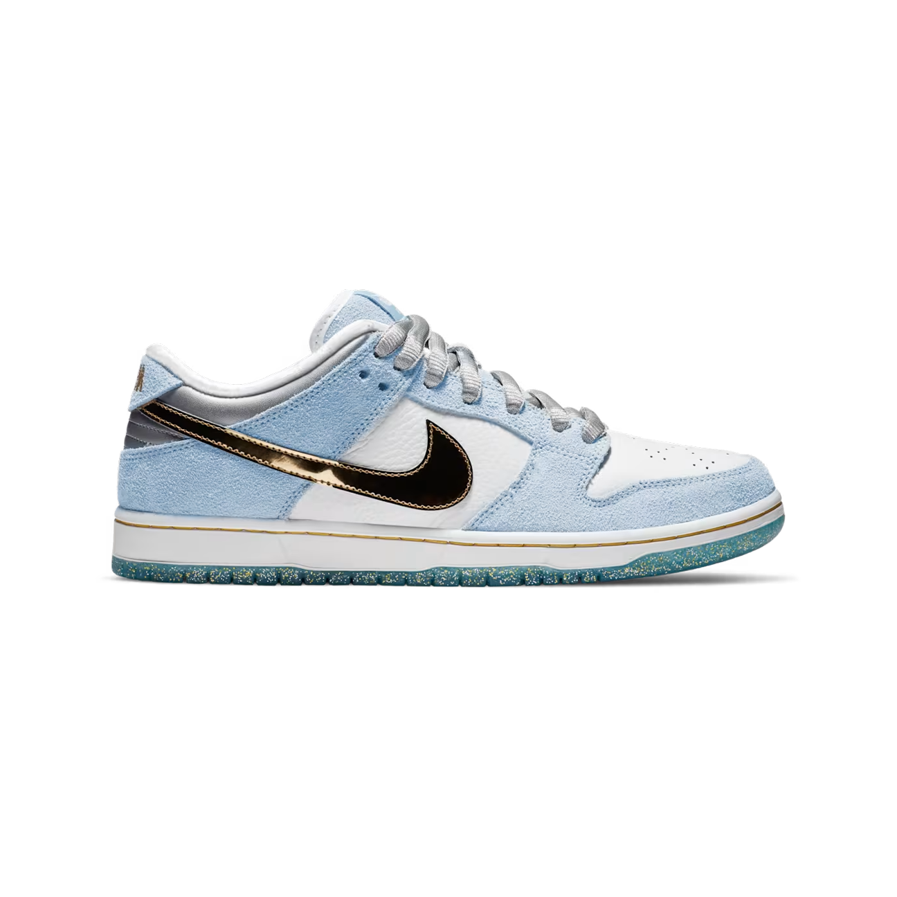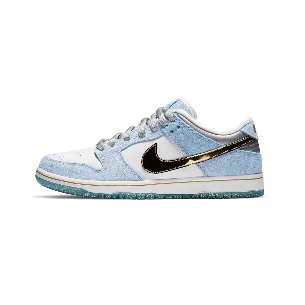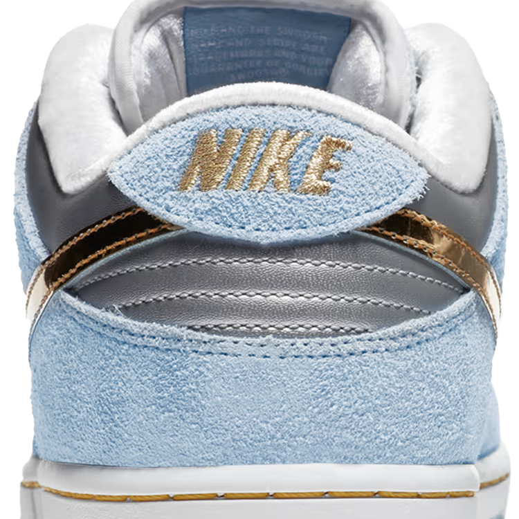 Nike SB Dunk Low Sean Cliver (Style DC9936-100) ist eine der begehrtesten und sammelwürdigsten SB Veröffentlichungen der letzten Jahre. Der Sneaker wurde vom Künstler und Skate Ikone Sean Cliver entworfen und trägt seine unverwechselbare Handschrift in Form von winterlichen Farben und kreativen Details. Hellblaues Wildleder, weißes Leder und metallisch goldene Akzente erzeugen einen hochwertigen Look, ergänzt durch eine glitzernde Midsole und eine Innensohle mit typischen Cliver Illustrationen.