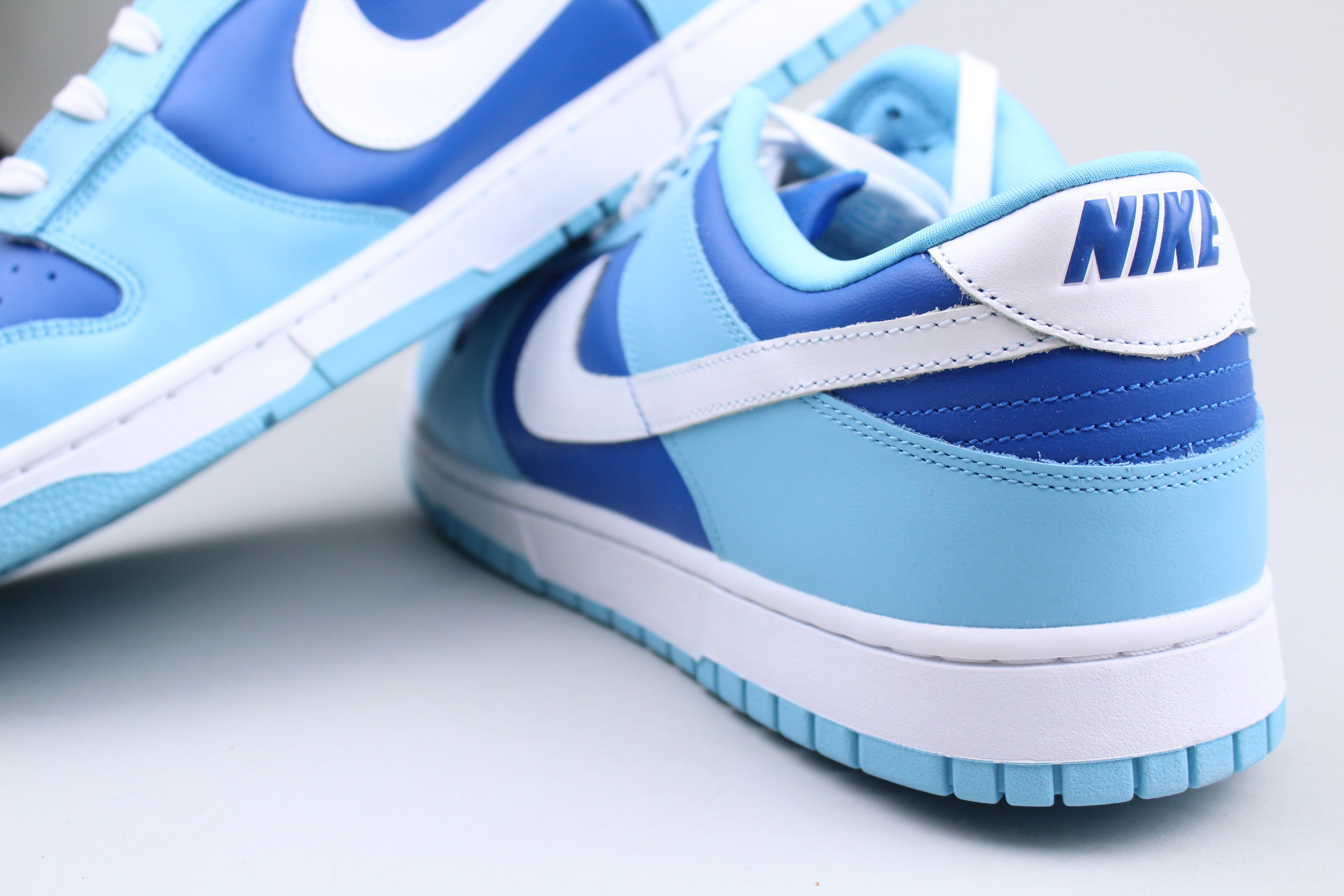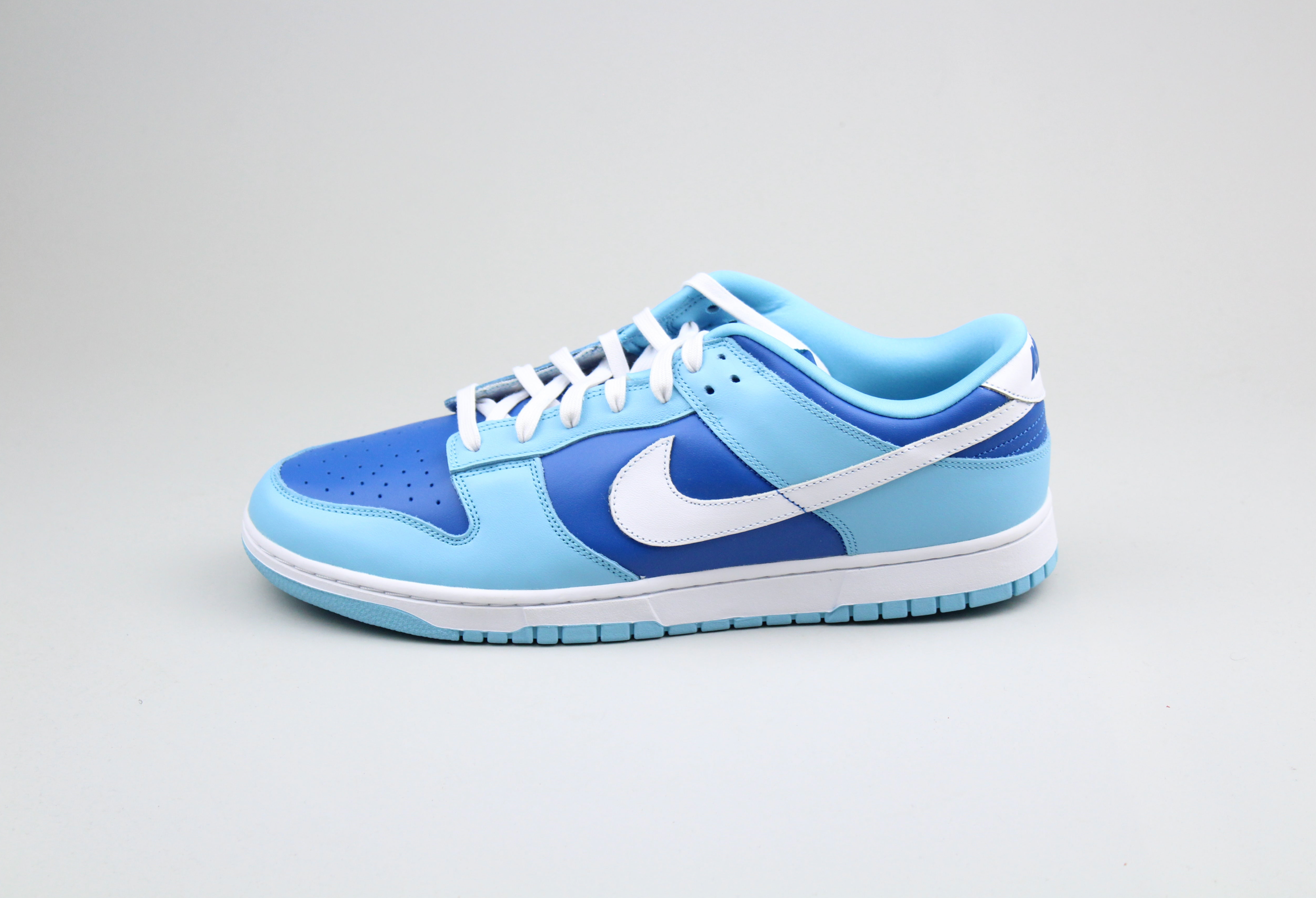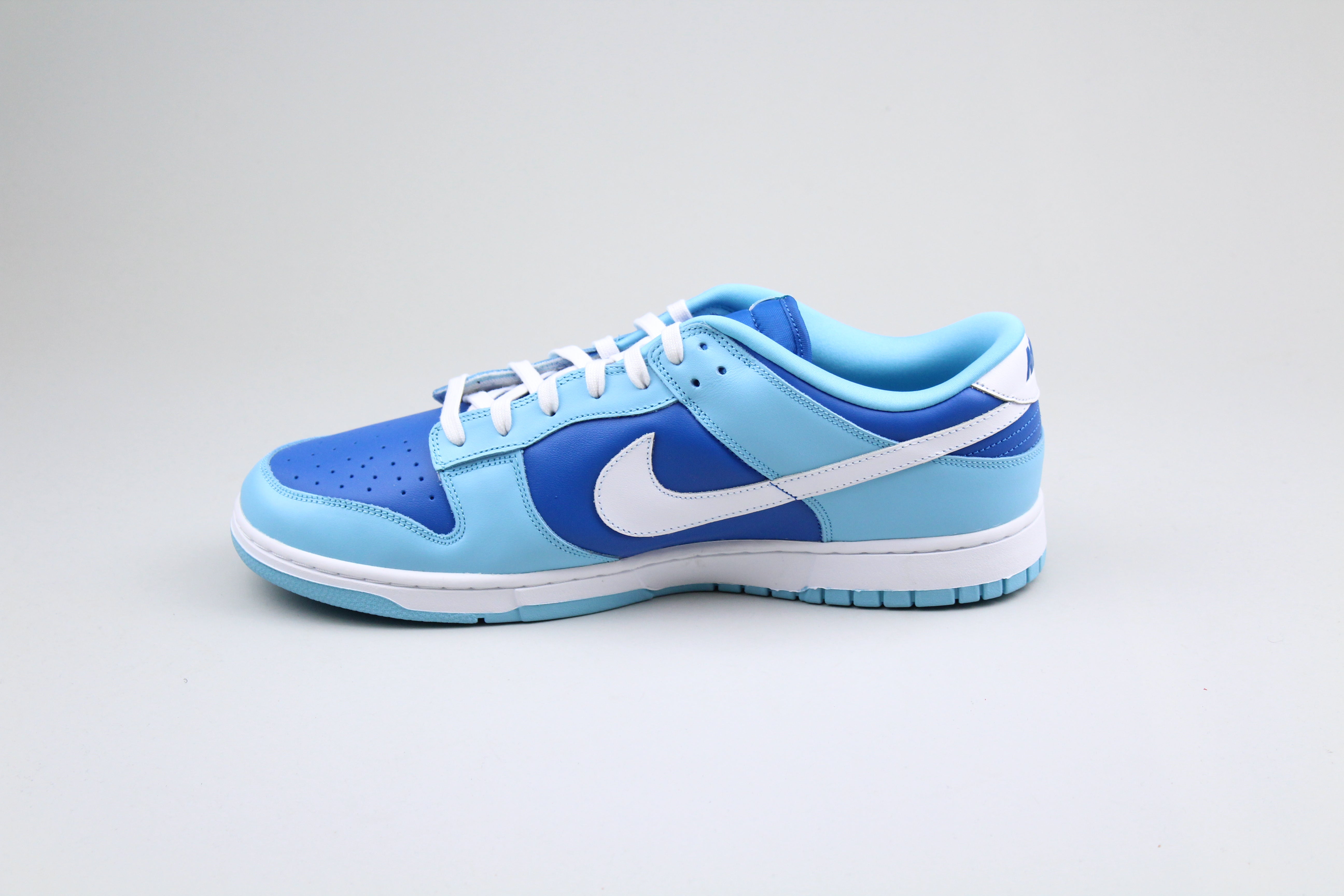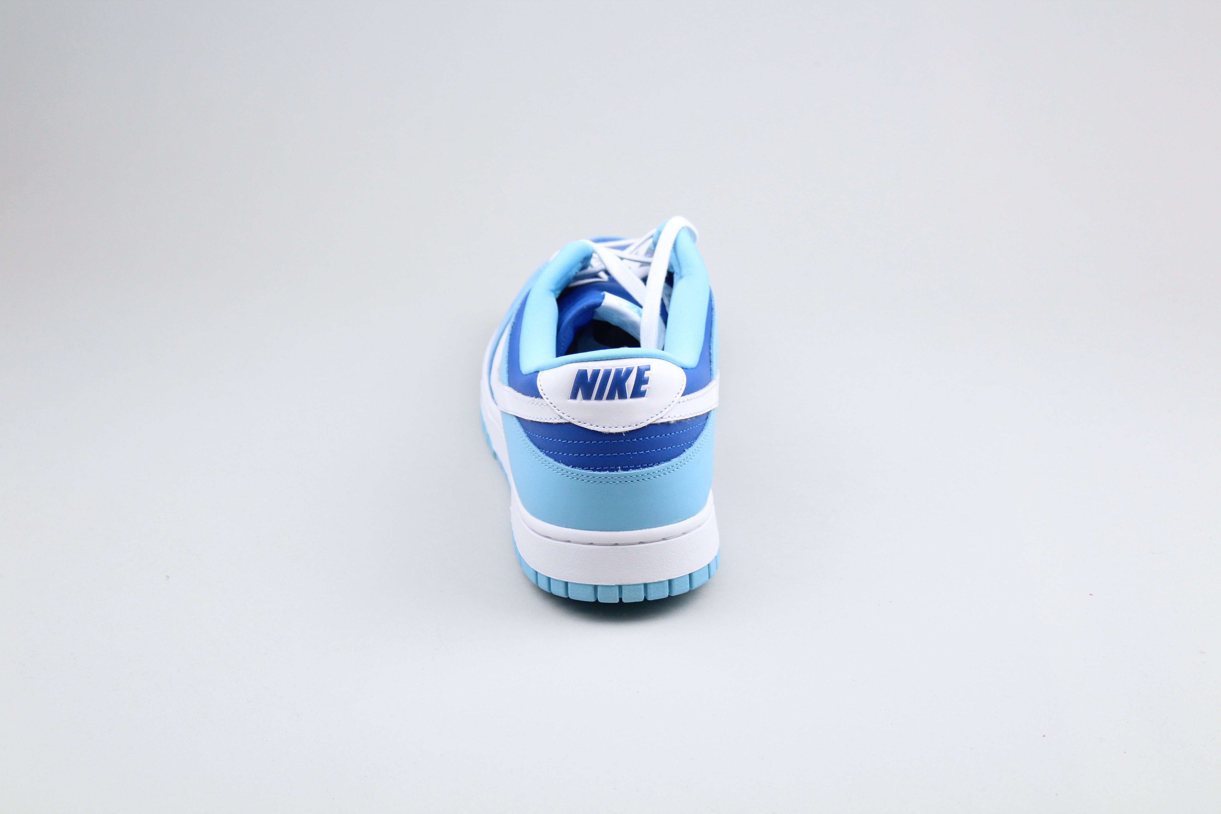 Die atmungsaktive Nylonzunge dieses Nike Dunk Low Retro QS hat ein gewebtes Nike-Etikett und die weiße Lederlasche auf der Rückseite weist ein schräges Nike-Wortzeichen in Blockbuchstaben auf. Der Schuh wird von einer typischen Gummi-Cupsohle mit pastellblauer Außensohle und weißen Seitenwänden getragen.