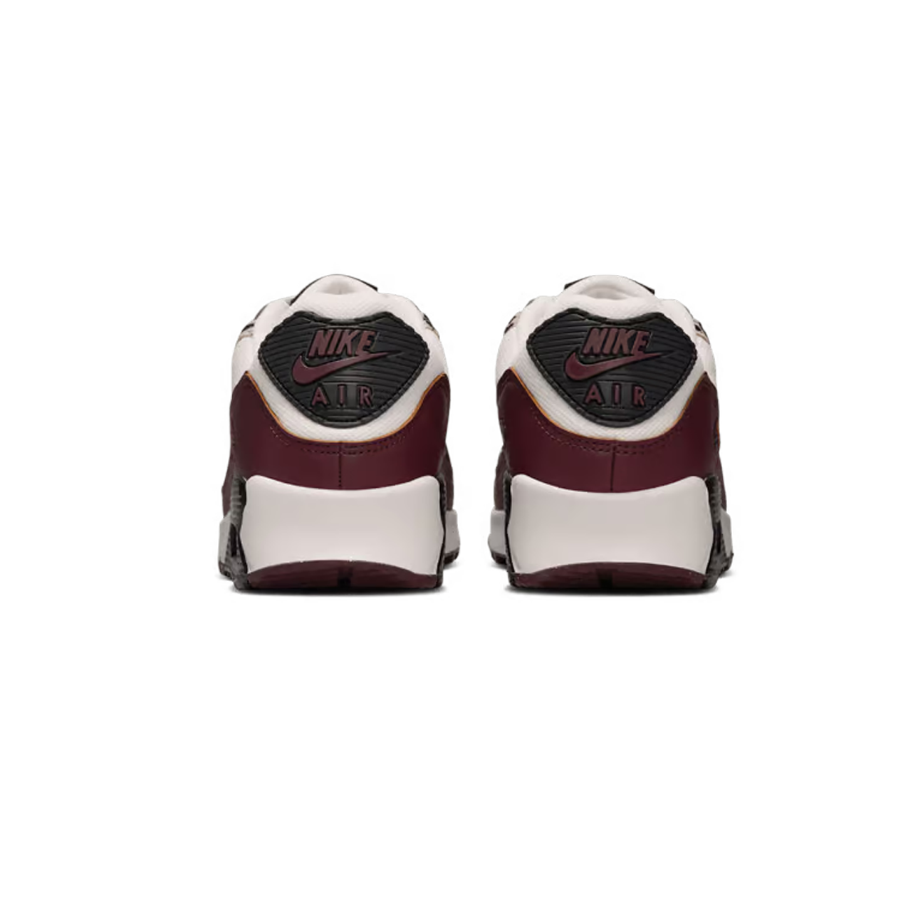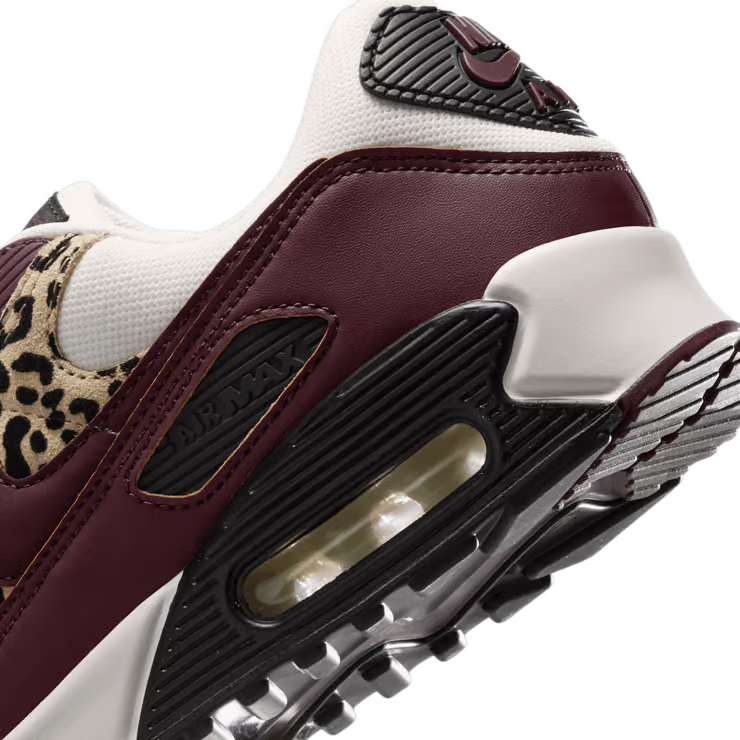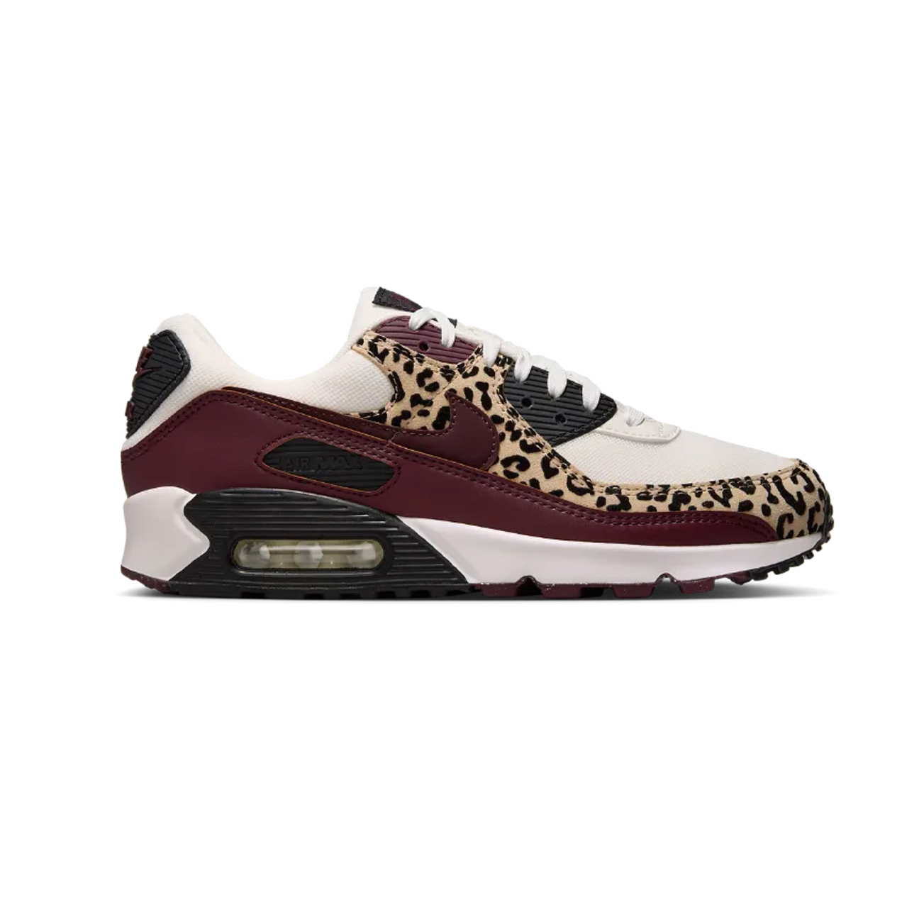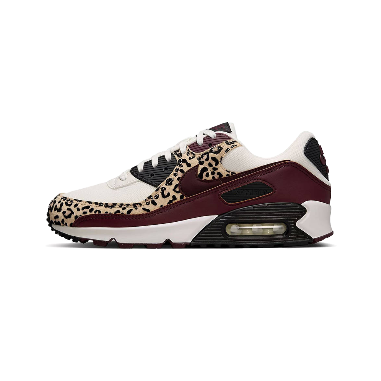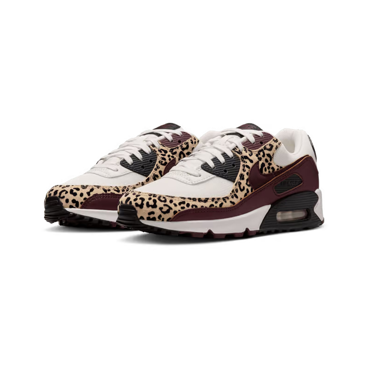 Nike Air Max 90 ‘Leopard Burgundy’ (Style IF1619-102) ist eine auffällige und stilvolle Variante des klassischen Air Max 90, bei der burgunderrote Akzente mit einem dezenten Leopard Print kombiniert werden. Das Upper besteht aus einer weißen Basis mit burgunderfarbenen Details an Mudguard, Eyelets und Branding, während das Animal Print Panel dem Sneaker einen modischen und luxuriösen Touch verleiht. Mesh, Leder und Wildleder sorgen für Komfort, Struktur und Haltbarkeit.