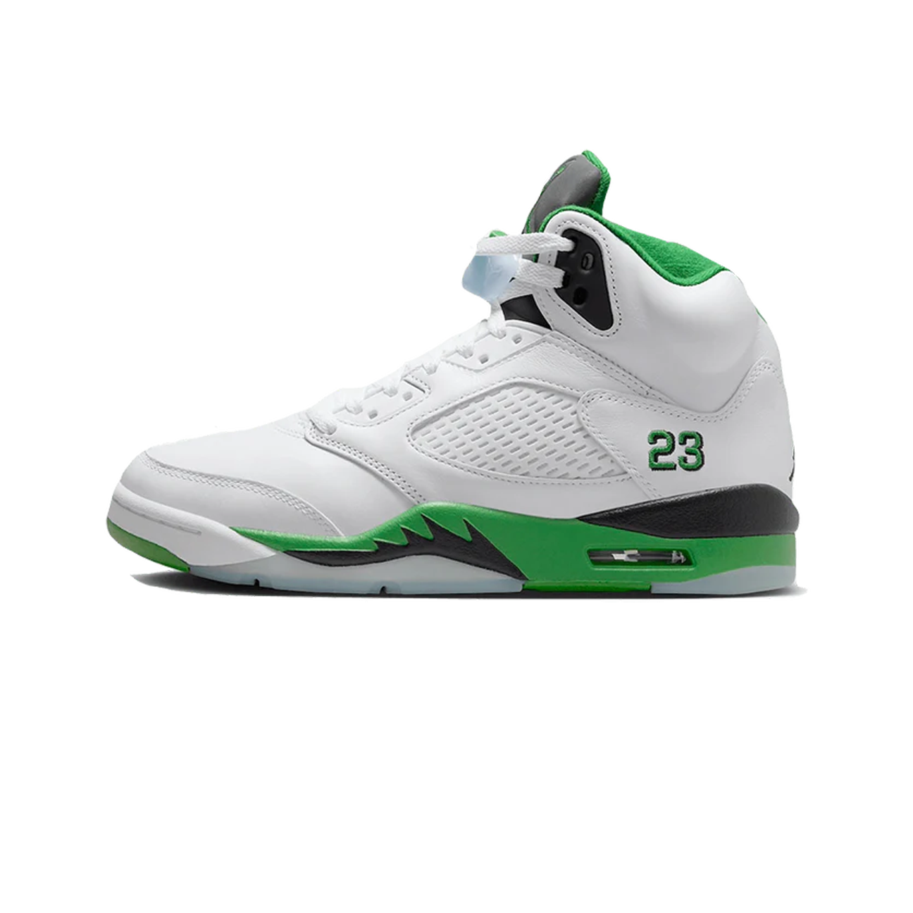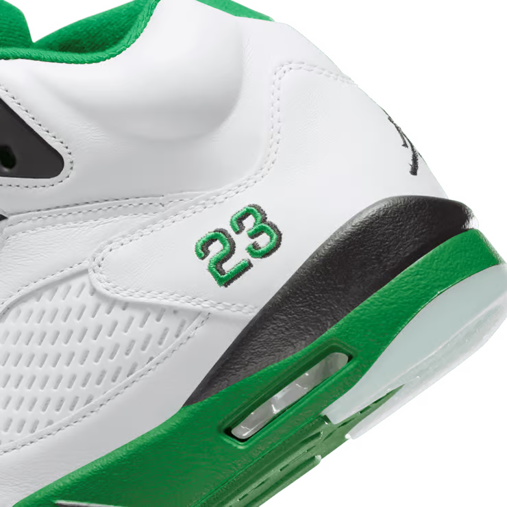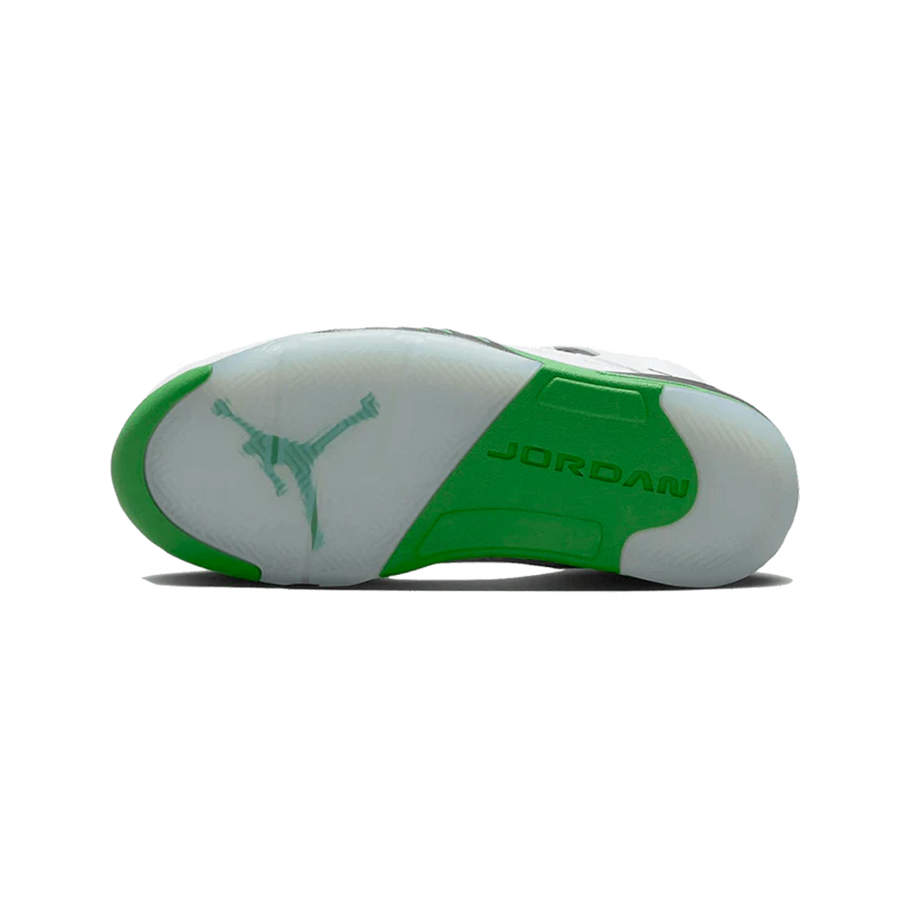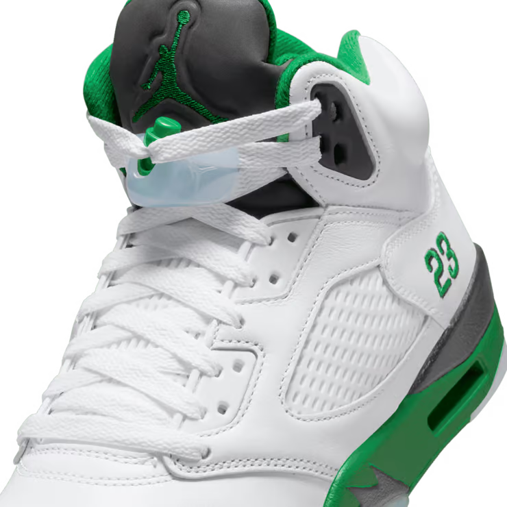 Das Design wird durch die ikonischen Mesh-Einsätze und die reflektierende Zunge hervorgehoben, die nicht nur einen sportlichen Touch verleihen, sondern auch die charakteristischen Elemente beibehalten, die Fans der Air Jordan-Linie lieben. Die Farbgebung „Lucky Green“ ist eine Hommage an den originalen Air Jordan 5 und enthält leuchtend grüne Details an der Zwischensohle und Außensohle für einen Farbtupfer, der Selbstvertrauen und Stil ausstrahlt.