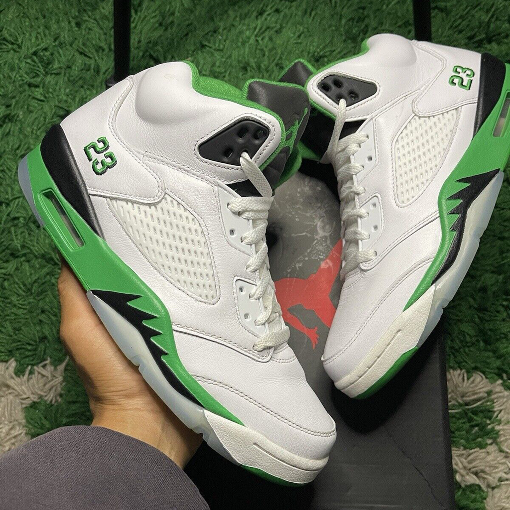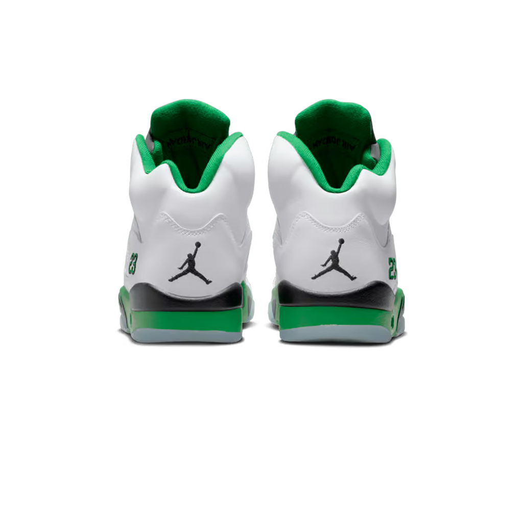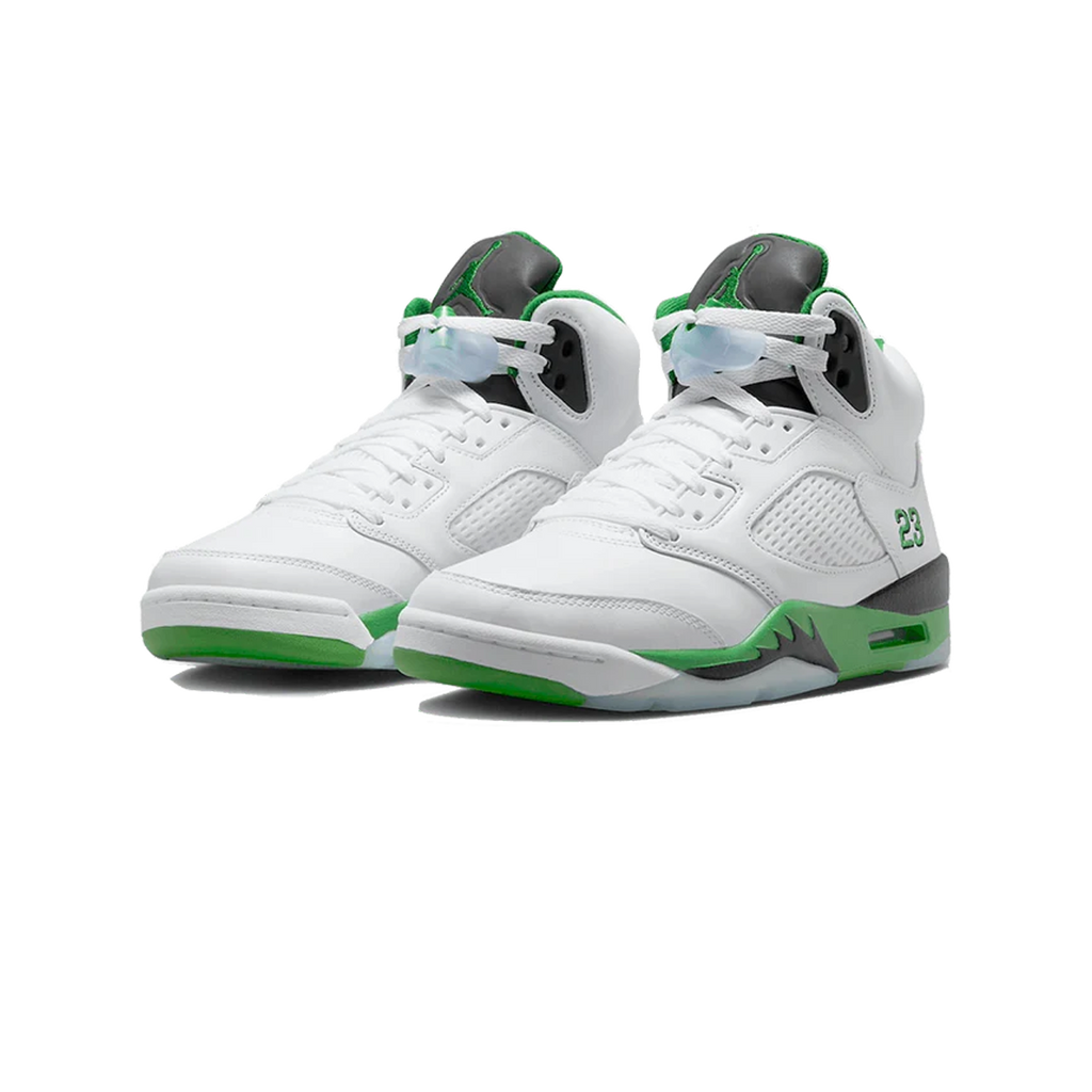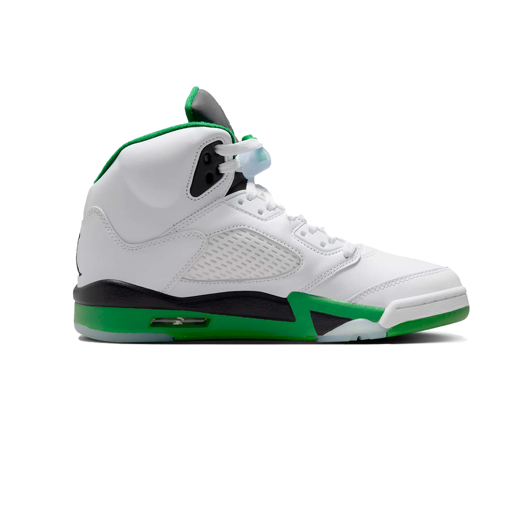 Das Design wird durch die ikonischen Mesh-Einsätze und die reflektierende Zunge hervorgehoben, die nicht nur einen sportlichen Touch verleihen, sondern auch die charakteristischen Elemente beibehalten, die Fans der Air Jordan-Linie lieben. Die Farbgebung „Lucky Green“ ist eine Hommage an den originalen Air Jordan 5 und enthält leuchtend grüne Details an der Zwischensohle und Außensohle für einen Farbtupfer, der Selbstvertrauen und Stil ausstrahlt.
