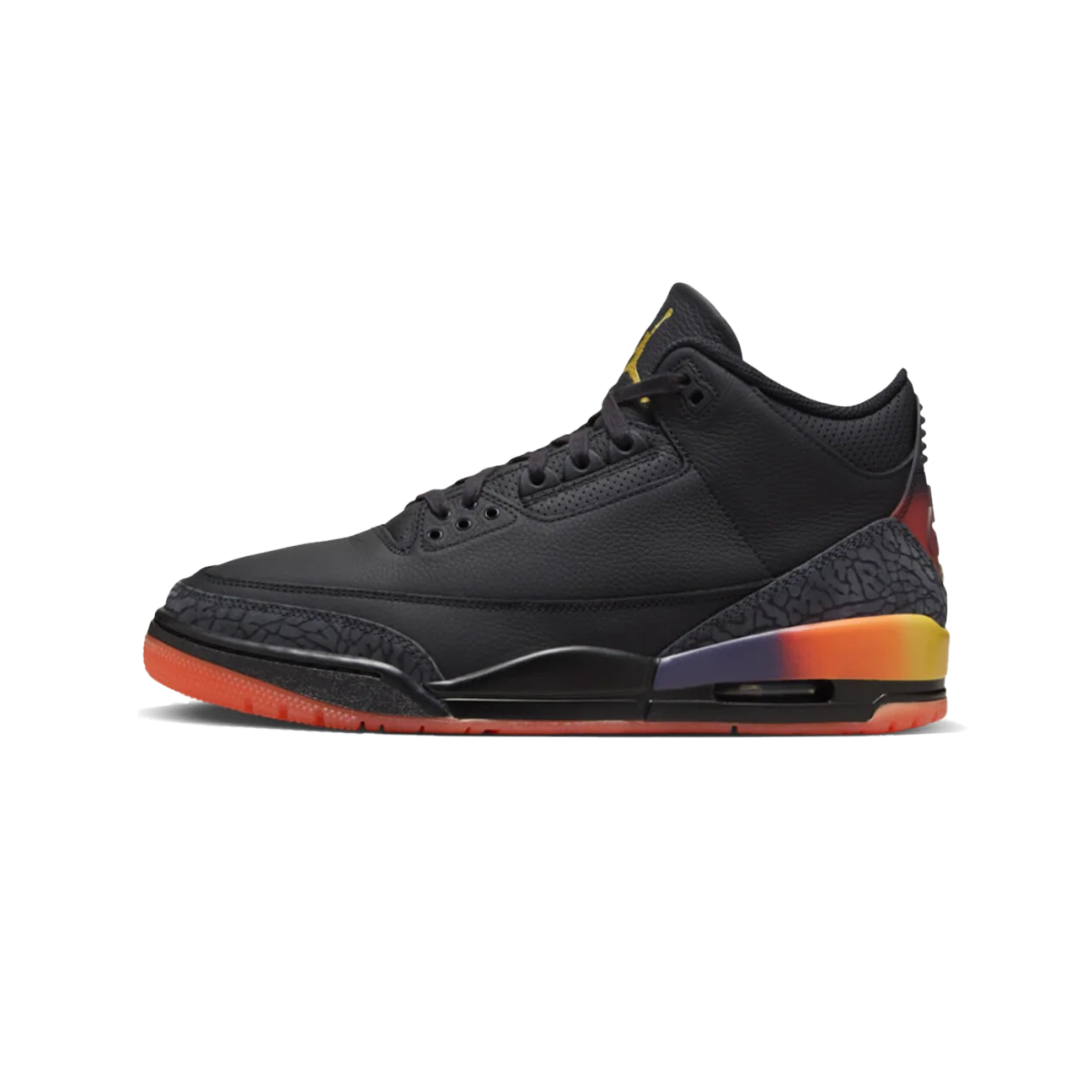 Der J Balvin x Air Jordan 3 Retro „Rio“ ist nach dem Sohn des Reggaeton-Künstlers benannt. Die klassische Silhouette hat ein Obermaterial aus schwarzem Leder mit grauen Elefanten-Print-Overlays an Vorderfuß und Ferse. Farbverlaufsakzente in Solar Flare und Total Crimson Abyss bedecken die hintere Lasche, die am linken Fuß mit dem Nike Air-Branding und am rechten mit J Balvins Smiley-Logo gekennzeichnet ist. Die Sonnenuntergangsfarben wiederholen sich auf der Rückseite der Polyurethan-Mittelsohle, unterstützt durch eine rot getönte, durchscheinende Gummi-Außensohle.