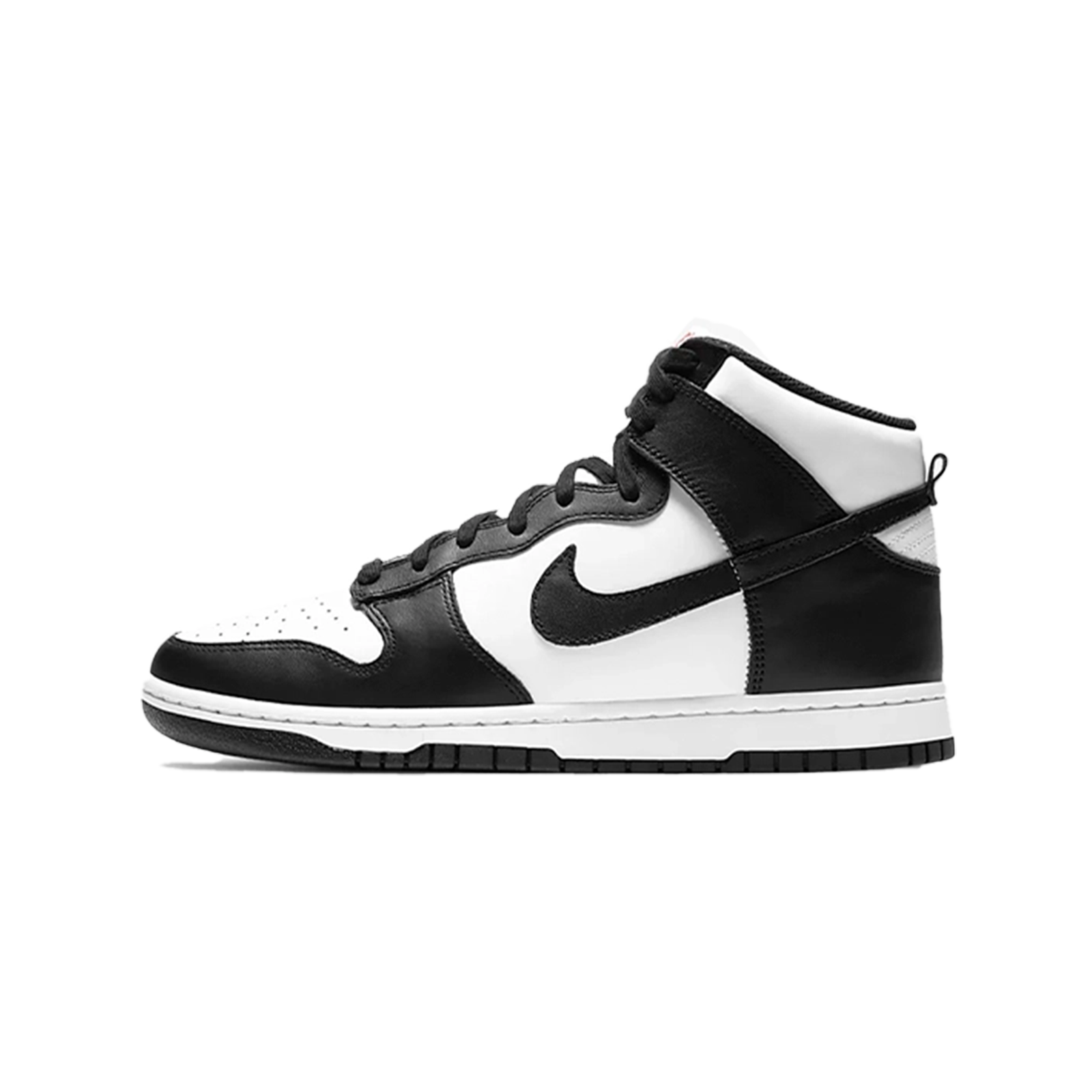 Der Nike Dunk High Retro 'Panda' (DD1399-105) kombiniert eine zweifarbige Farbgebung mit der ikonischen Silhouette des Sneakers. Getreu dem Original von 1985 besticht der Schuh durch ein Obermaterial aus Leder in stark kontrastierenden Schwarz-Weiß-Tönen. Die glatten Leder-Overlays, Schnürsenkel und der Swoosh sind komplett in Schwarz gehalten, während Zehenkappe, Zunge und Kragen den Yin-Yang-Look in Weiß ausgleichen. Ein gewebtes Etikett mit karmesinrotem Nike-Branding befindet sich auf der leicht gepolsterten Nylonzunge und verleiht dem Design einen Farbtupfer.