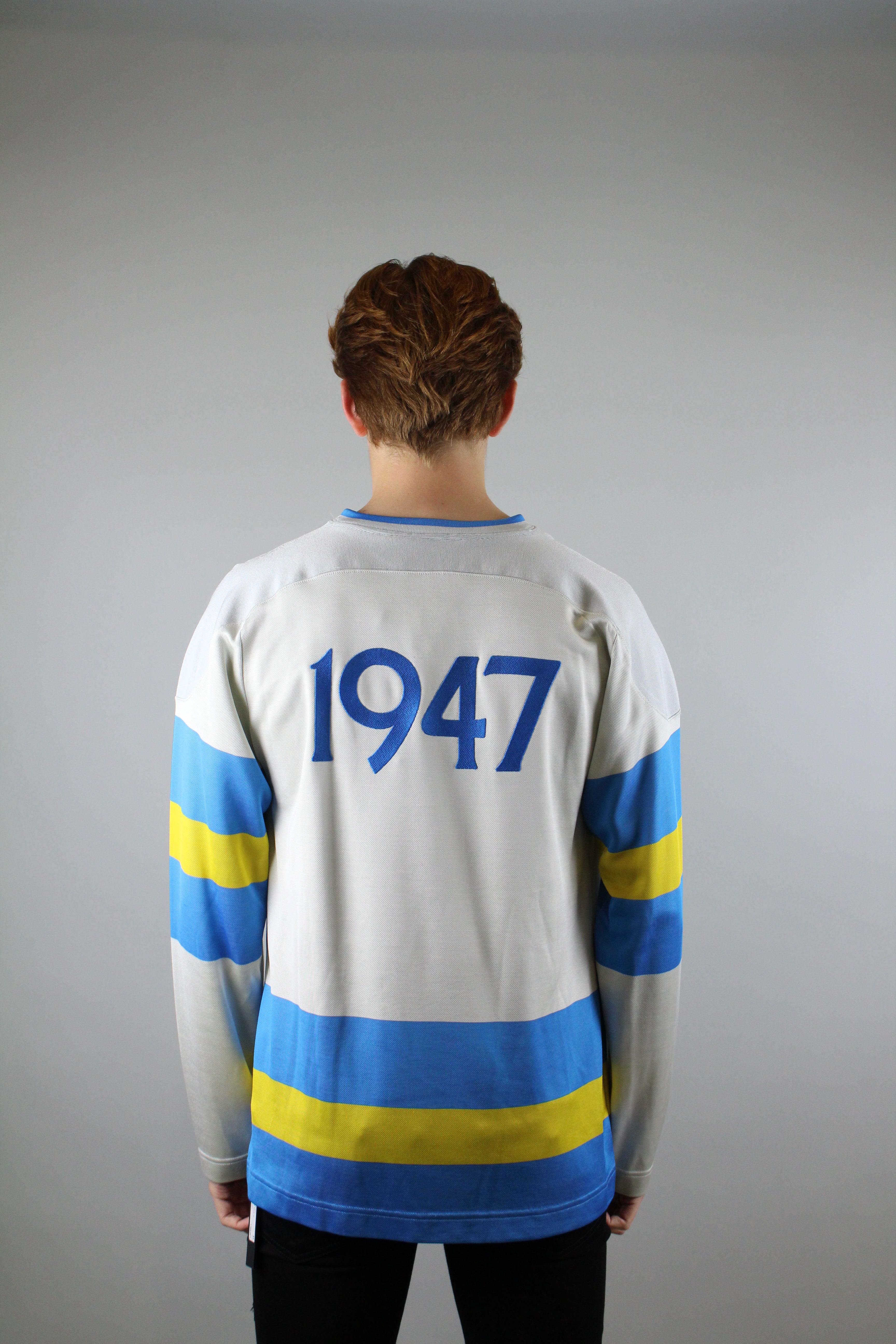 Das langärmelige Hockeytrikot von Dior und Jack Kerouac besteht aus einem weißen Viskosestrick mit normaler, entspannter Passform, einem hellblauen V-Ausschnitt, hellgrauen Einsätzen an den Schultern, einem großen hellblauen Einsatz mit gelben Mittelstreifen um den Saum und die mittleren Ärmel, einem hellblauen „DIOR“-Logoaufdruck auf der Brust und einem hellblauen „1947“-Aufdruck auf dem Rücken.