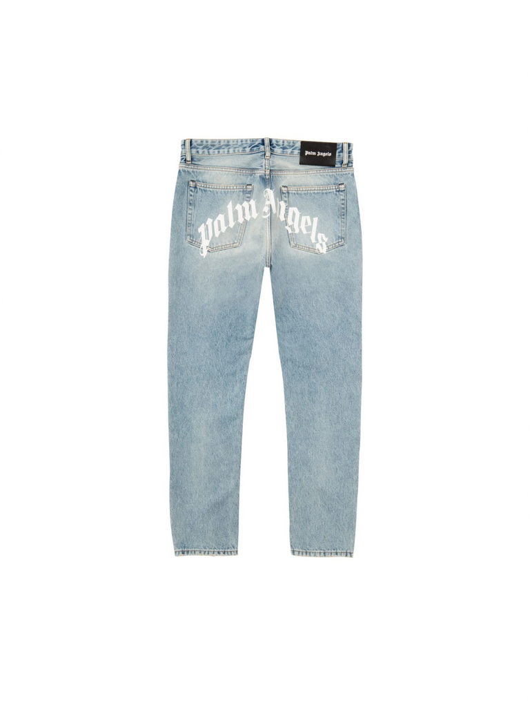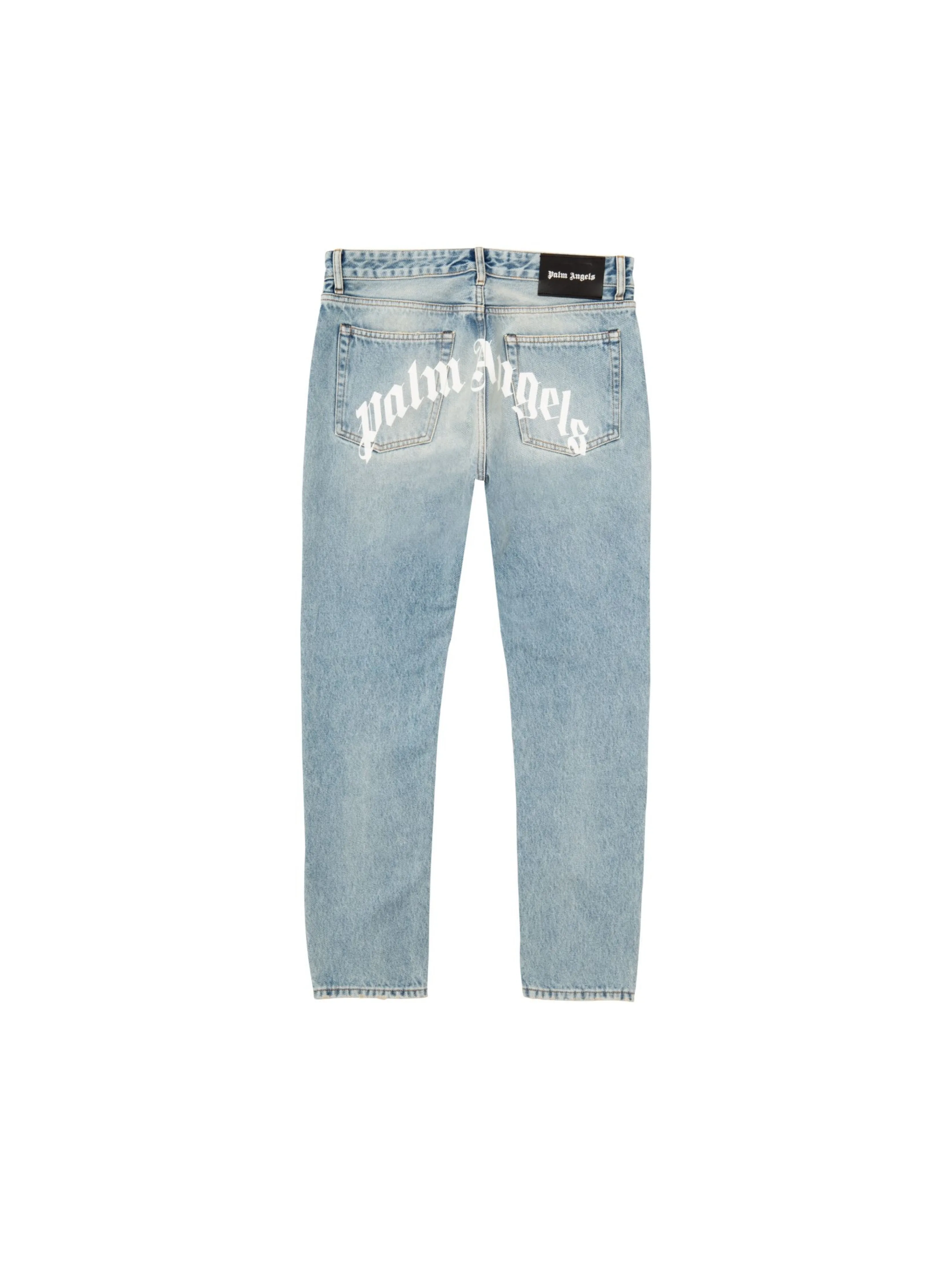 Röhrenjeans in Hellblau mit geschwungenem Palm Angels-Logo auf der Rückseite.
