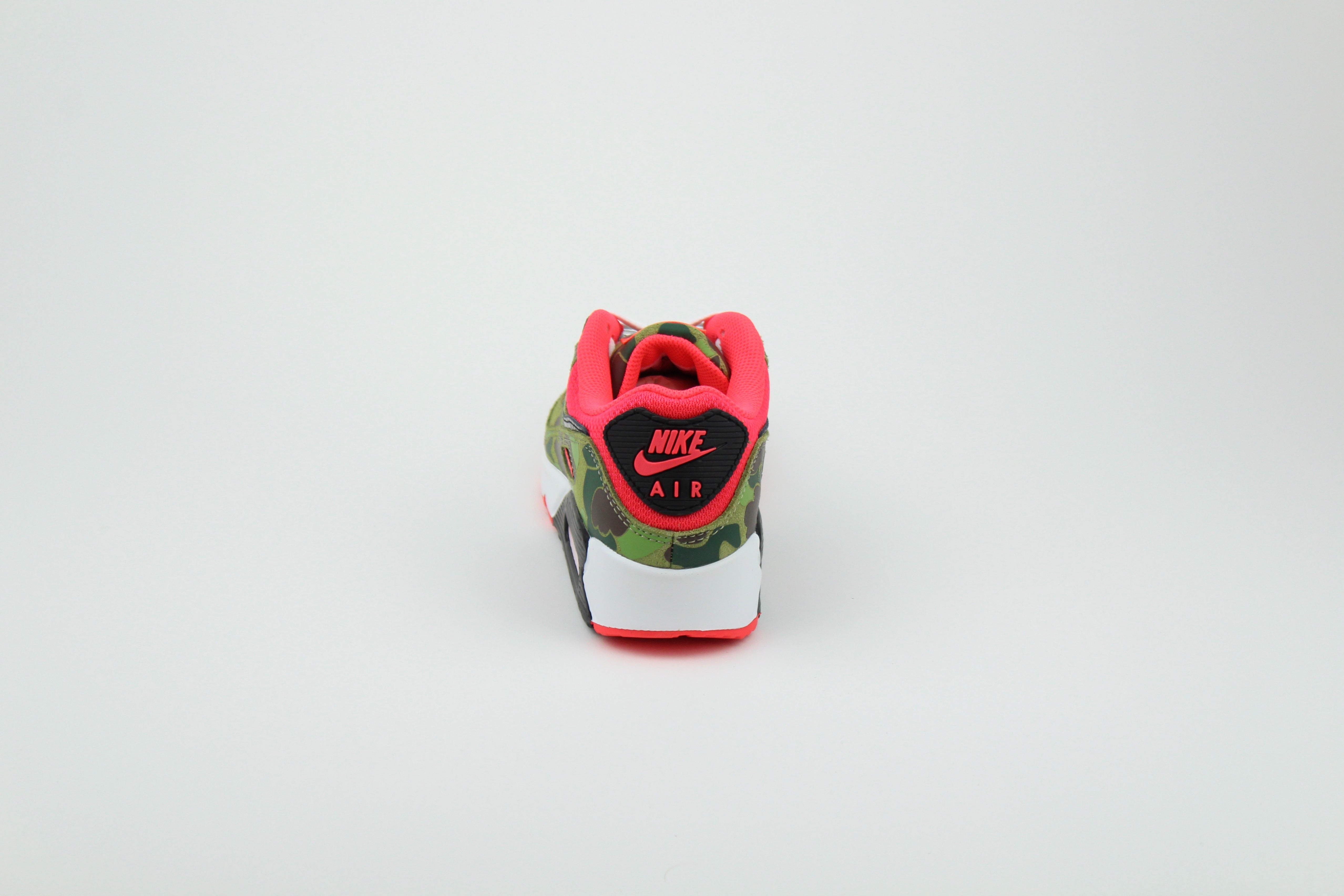 Der „Reverse Duck Camo“ präsentiert einen markanten Camouflage-Print in Erdtönen, darunter leuchtende Orange- und Grüntöne, vor einem eleganten schwarzen Hintergrund. Dieses auffällige Muster verleiht dem klassischen Air Max 90 eine verspielte Note und macht ihn zu einem herausragenden Stück, das die Blicke auf sich zieht.