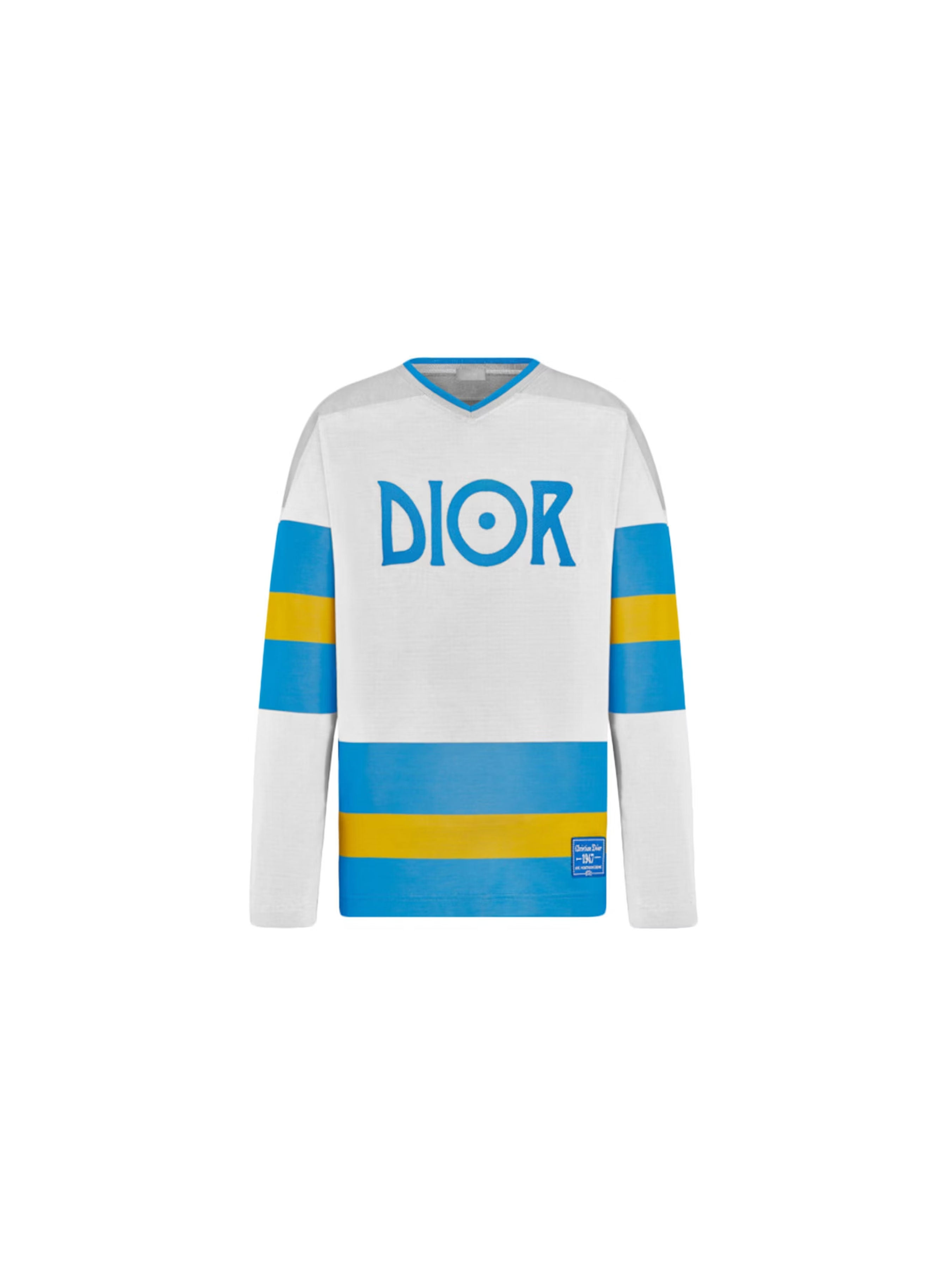 The long sleeve hockey jersey from Dior and Jack Kerouac features a white viscose knit with a regular relaxed fit, a light blue V-neck, light grey panels on the shoulders, a large light blue panel with yellow middle stripes around the hem and middle sleeves, a light blue 'DIOR' logo print on the chest, and a light blue '1947' print on the back.