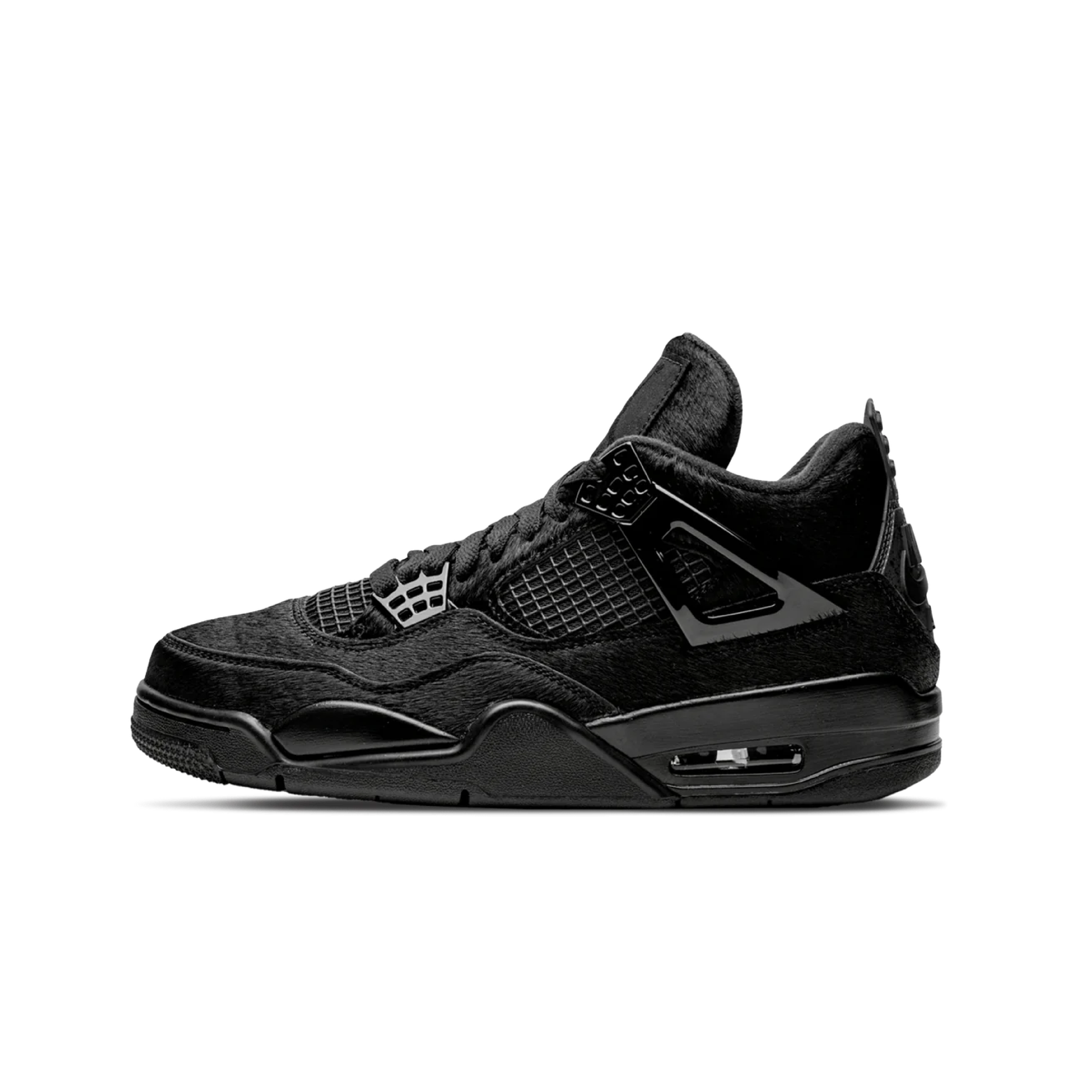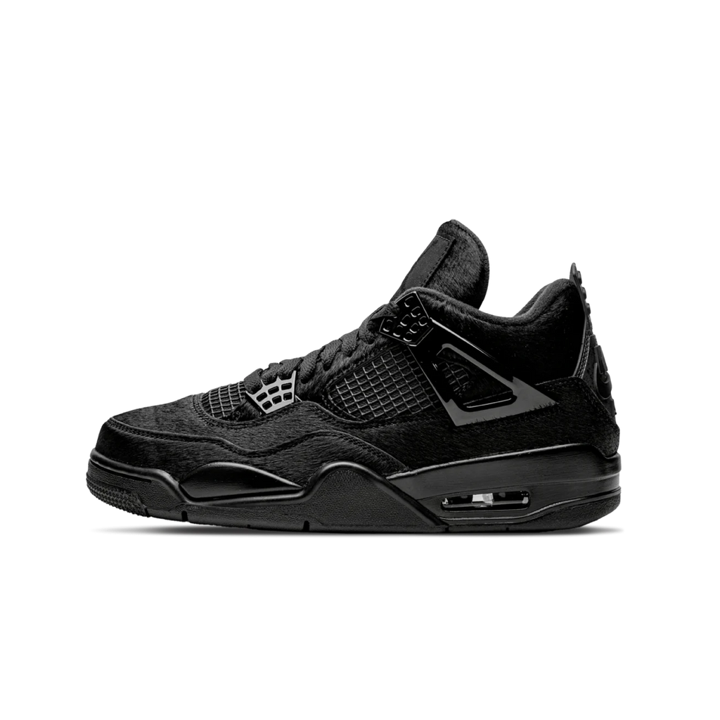 The original Black Cat 4 served as inspiration for this Jordan 4, but it is taken to the limit. Pony hair in a blacked-out color makes up the upper, which has shiny hardware. Also, this is the first time the Nike Air logo has appeared on the heel tab of a women’s release Jordan 4. A blacked out mid and outsole completes the design.