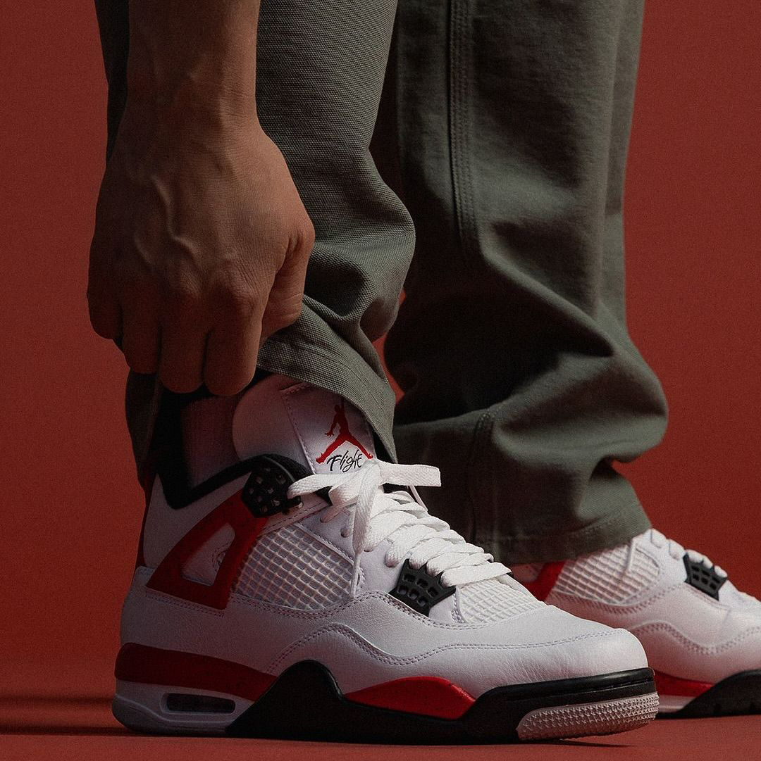 Jordan 4 Retro ‘Red Cement’ (style DH6927-161) delivers a bold and energetic twist on the classic Jordan 4 design. The sneaker features a white leather upper paired with bright red speckled cement overlays on the wings, heel tab and midsole. These red speckle patterns reference the historic ‘White Cement’ colourway, reimagined with a more powerful and modern expression.