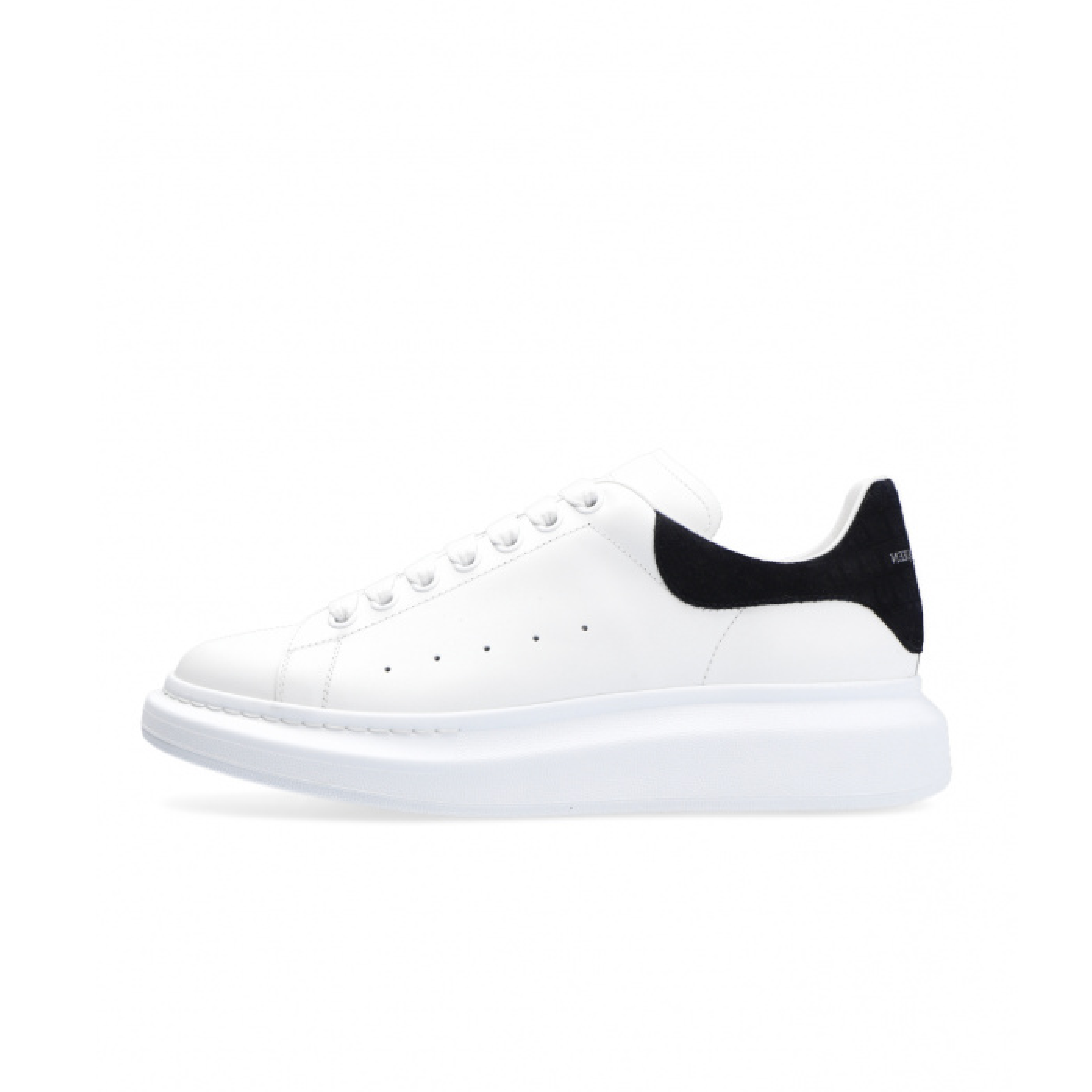 Smooth white calfskin lace-up sneakers with a rounded toe and a black, suede heel accent. On the tongue and heel counter are the signatures of Alexander McQueen and large flat laces. extra-large rubber sole.