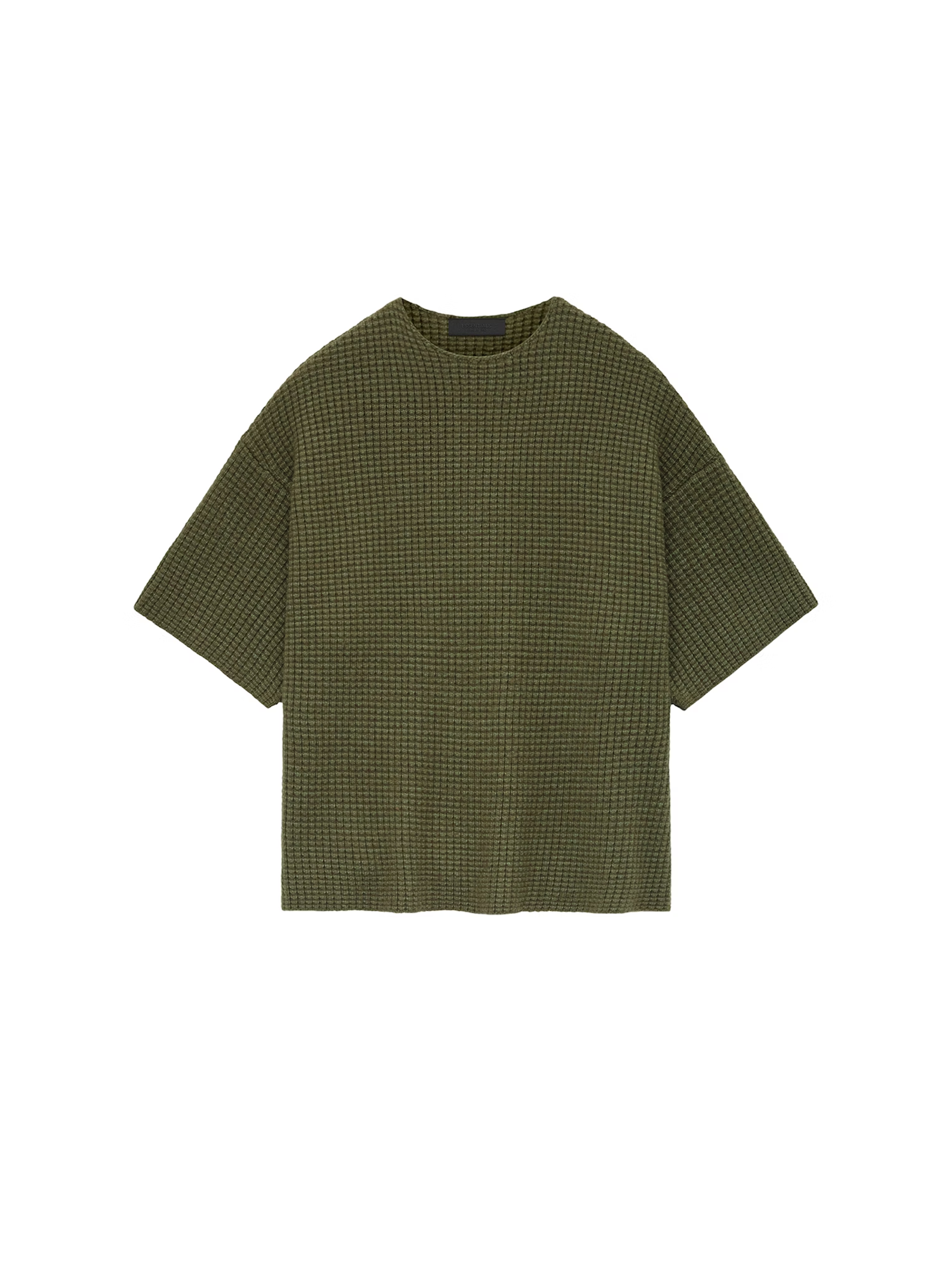 Made from a durable heavy waffle knit fabric, this short-sleeve tee offers a unique texture that enhances both comfort and breathability. The military green color provides a fresh, earthy tone that can seamlessly integrate into a variety of outfits.