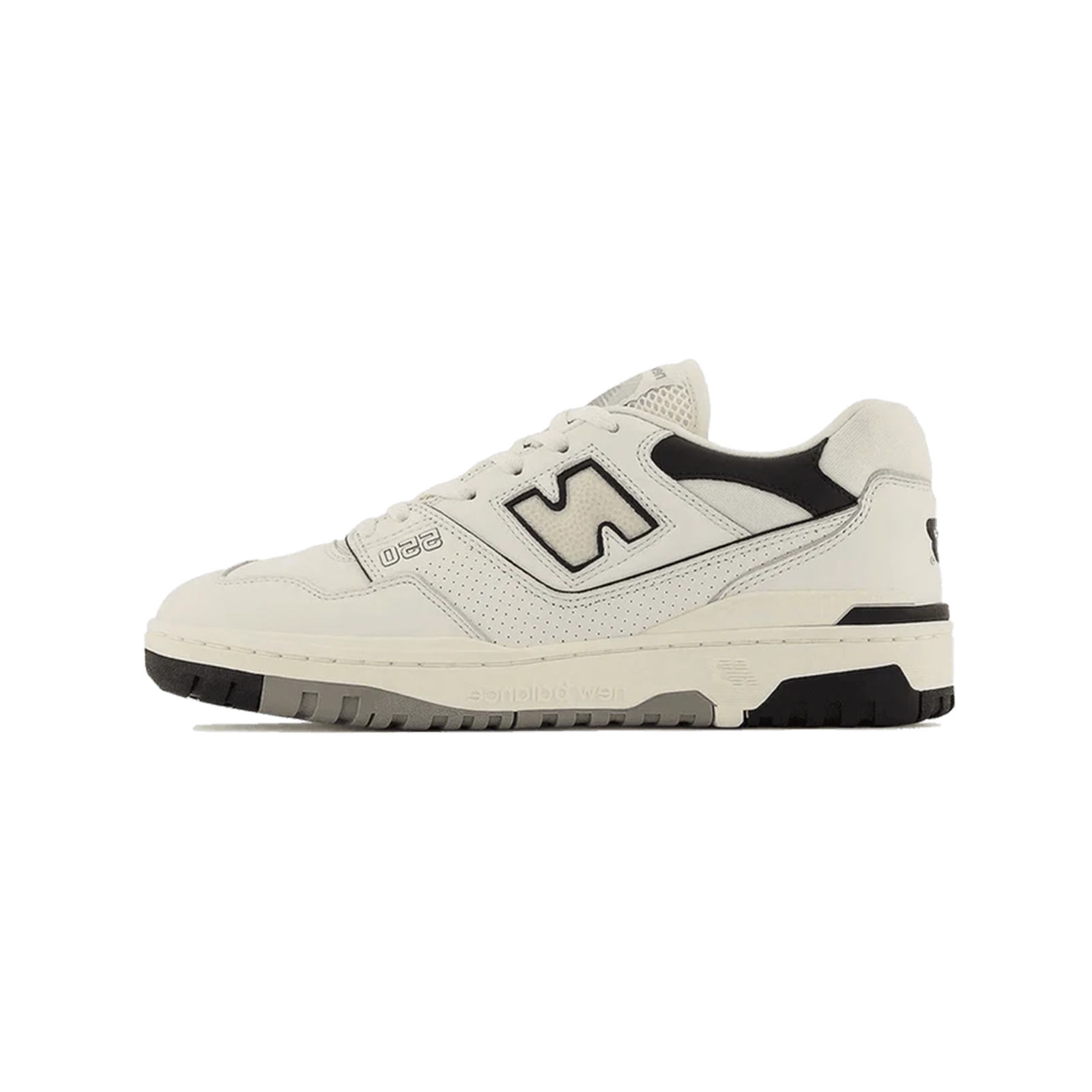 The New Balance 550 'Cream Black' is a quintessential sneaker that perfectly blends vintage aesthetics with modern flair. Released on July 5, 2022, this model features a smooth white leather upper adorned with perforated overlays for a sophisticated look. Black piping and mesh collars, along with the signature cracked leather New Balance logos, add a touch of elegance. The sneaker's design is completed with a woven label on the tongue that nods to New Balance Basketball's rich heritage, making it a must-have for both sneaker enthusiasts and casual wearers alike. Its matching sole not only ensures durability but also provides the grip needed for everyday adventures.