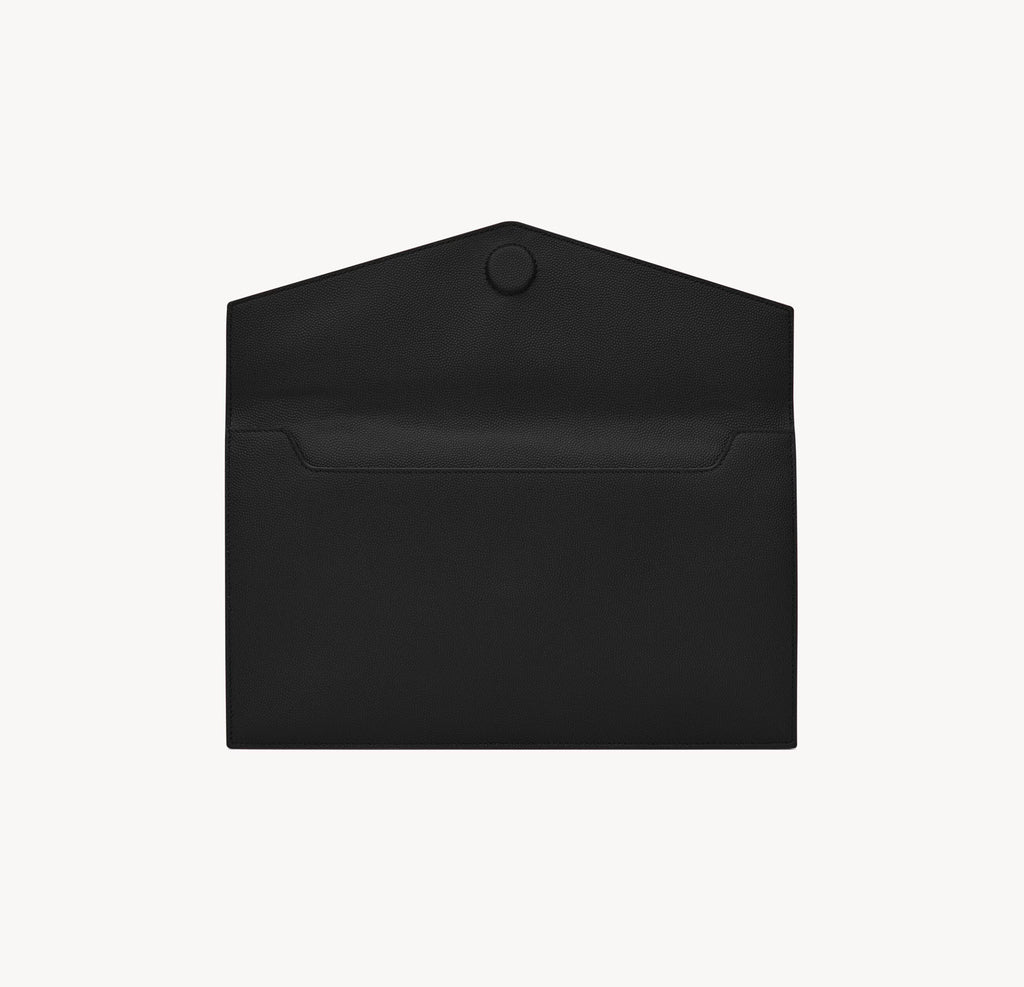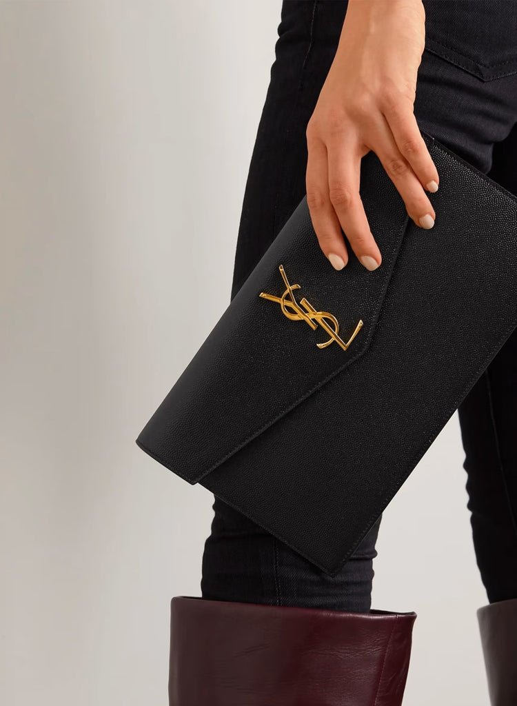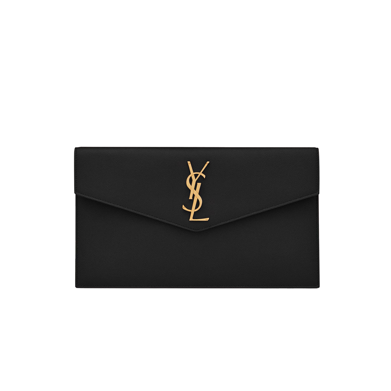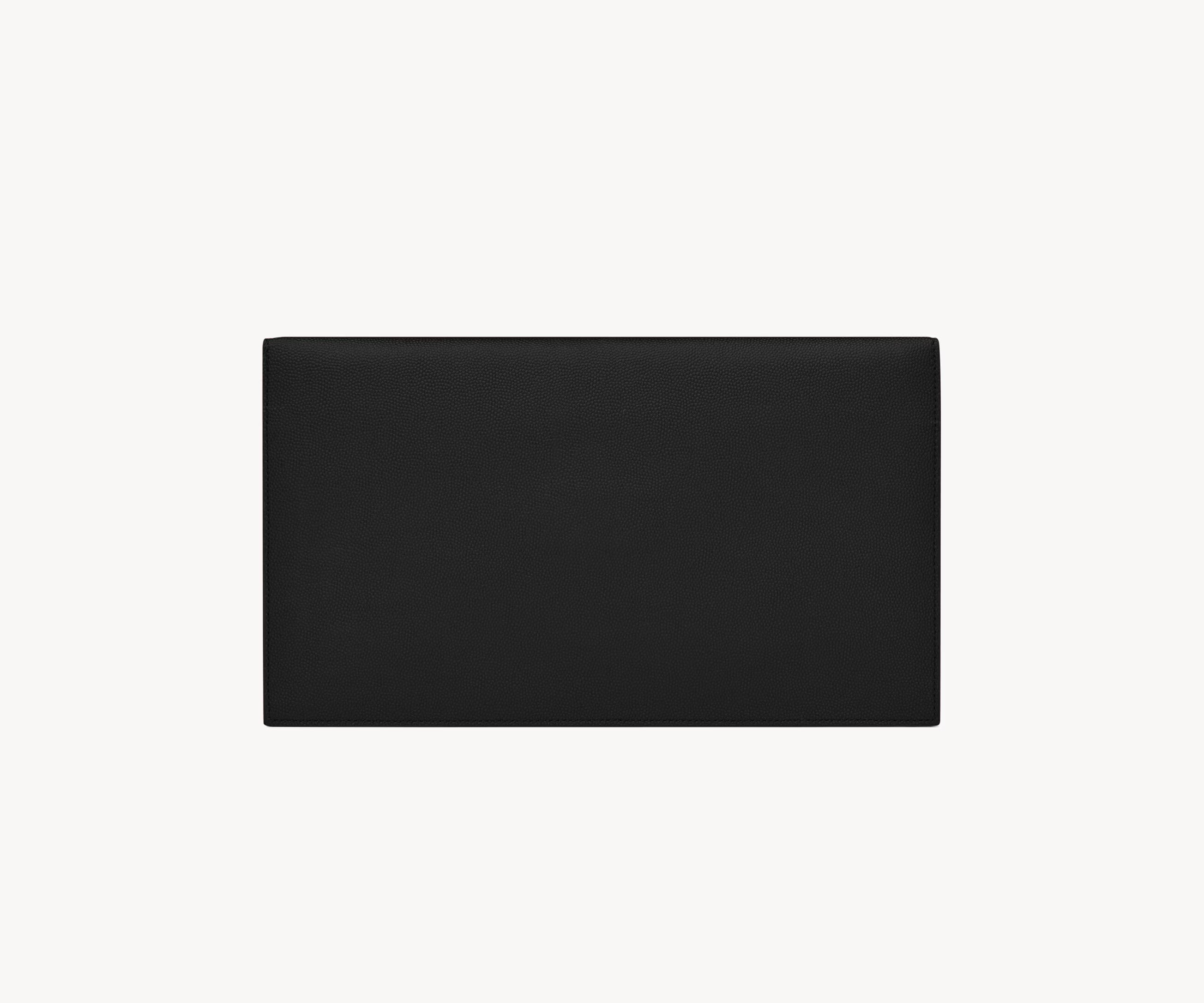 De Yves Saint Laurent Pochette Uptown Black (stijl 5657391GF0J1000) is een elegante en tijdloze clutch die de kenmerkende luxe van Saint Laurent perfect belichaamt. De tas is uitgevoerd in hoogwaardig glad kalfsleer met een diepe zwarte afwerking en is afgewerkt met het iconische goudkleurige YSL logo aan de voorzijde. De slanke envelope vorm met magnetische flap zorgt voor een verfijnde uitstraling, terwijl het compacte formaat ideaal is voor dagelijkse essentials zoals kaarten, telefoon en sleutels.