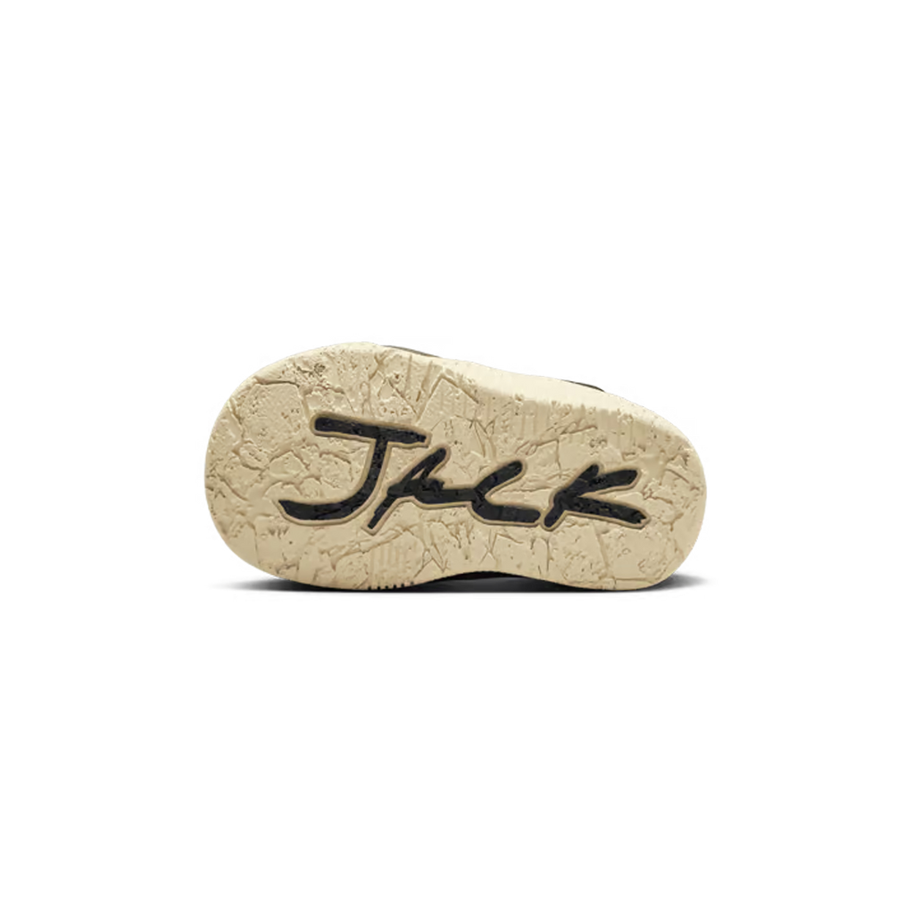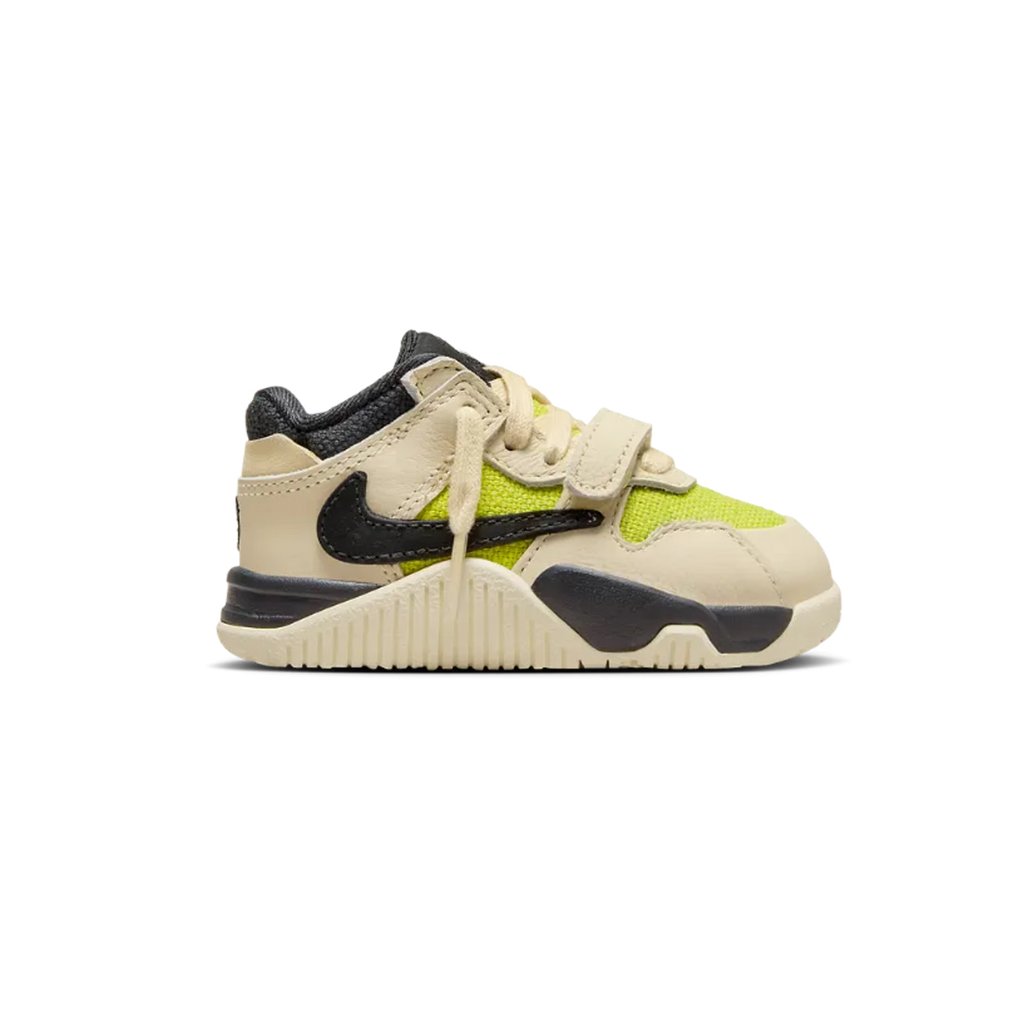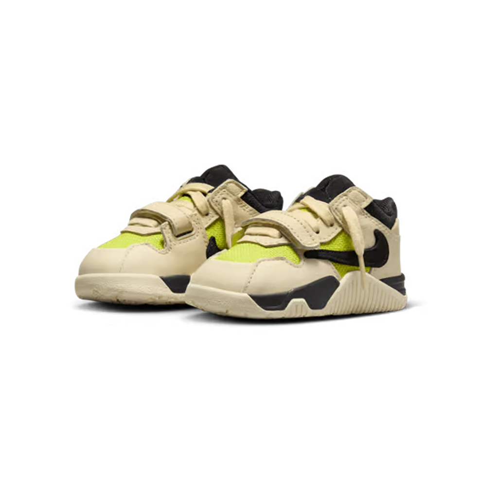 De Travis Scott x Jordan Jumpman Jack Bright Cactus TD (stijl FJ2852-102) is een opvallende en speelse kindersneaker die dezelfde esthetiek en attitude behoudt als de volwassen uitvoering. Het bovenwerk bestaat uit een combinatie van canvas en leer in een kleurenschema van muslin, zwart en het iconische Bright Cactus groen. De ronde vormen, zachte padding en een veilige klittenbandsluiting zorgen voor maximaal comfort en gebruiksgemak voor kleintjes. Ondanks het compacte formaat behoudt de schoen de herkenbare details zoals de Cactus Jack accenten en de karakteristieke buitenzool.