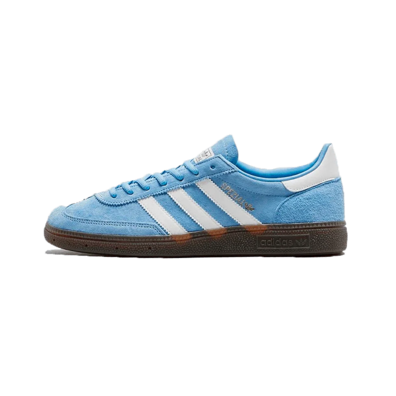 De zachte lichtblauwe tint biedt een veelzijdige en opvallende uitstraling, perfect voor casual uitjes of sportieve avonturen. Iconische witte adidas-strepen lopen langs de zijkanten, wat een klassieke touch toevoegt die de retro aantrekkingskracht versterkt. De "Handball Spezial" branding is subtiel aan de zijkant geplaatst, wat de erfgoedwortels benadrukt.