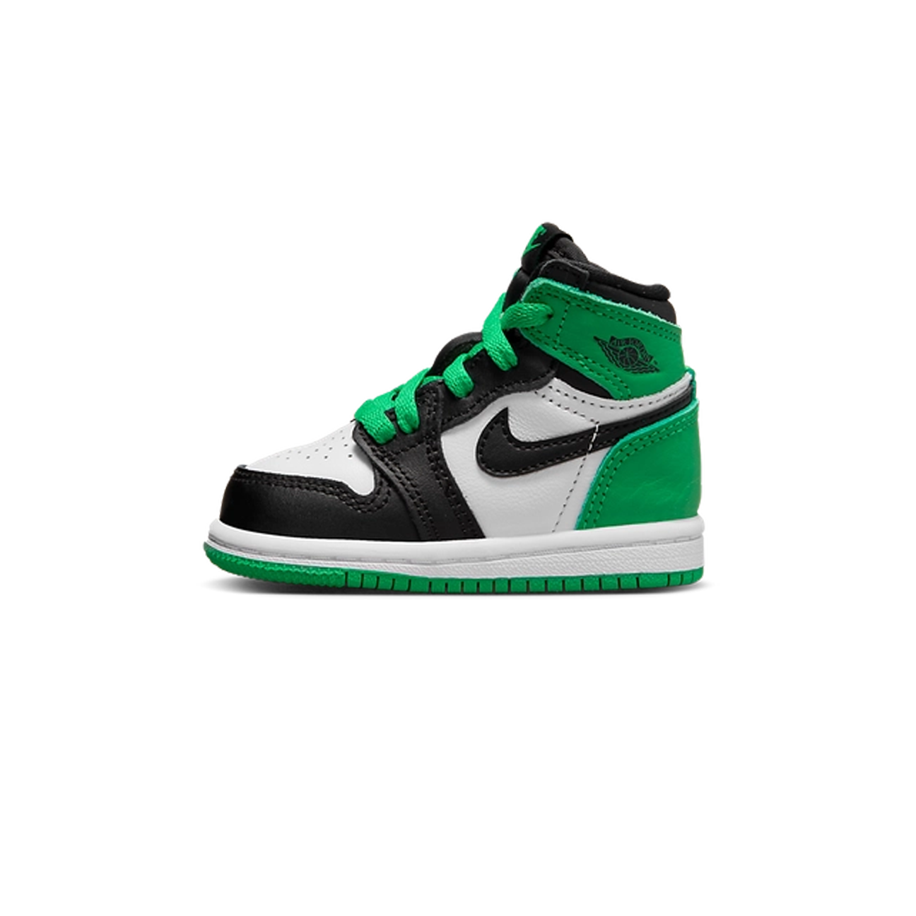 De Air Jordan 1 Retro High OG 'Lucky Green' voor kinderen heeft een verleidelijk kleurenpalet dat klaar is om te schitteren en de aandacht te trekken. De sneaker is geplaatst op een witte, gladde leren basis en is afgewerkt met zwarte overlays rond de tenen en een vetersysteem. De kraag van het hoge silhouet is zwart, met een groene overlay met het Wings-logo in het zwart. De hieloverlay is groen uitgevoerd, terwijl de Swoosh is gemaakt van zwart glad leer, waardoor het een mooie contrasterende combinatie is. De tong is voorzien van een groen Nike-logo op een zwarte achtergrond. Een witte tussenzool completeert het ontwerp in combinatie met een groene buitenzool.