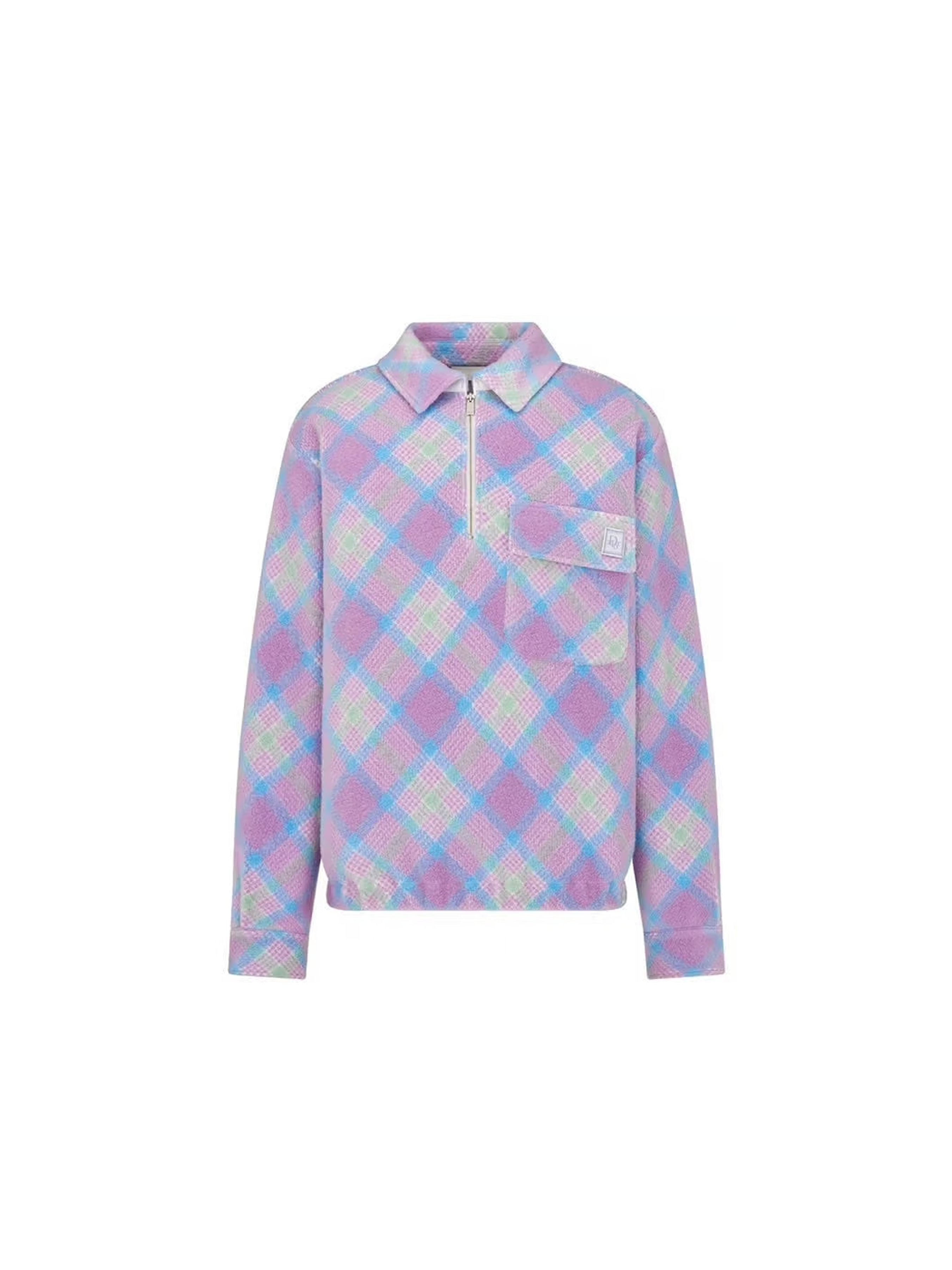 Deze Dior x ERL fleece sweatshirt heeft een witte katoenen voering en een diagonaal/diamant tartan acrylfleece gebreid in paars, lavendel, lichtblauw, lichtgroen en wit. In de linkerhoek van de opgezette linkerborstzak bevindt zich een klein wit Dior x ERL-embleem.