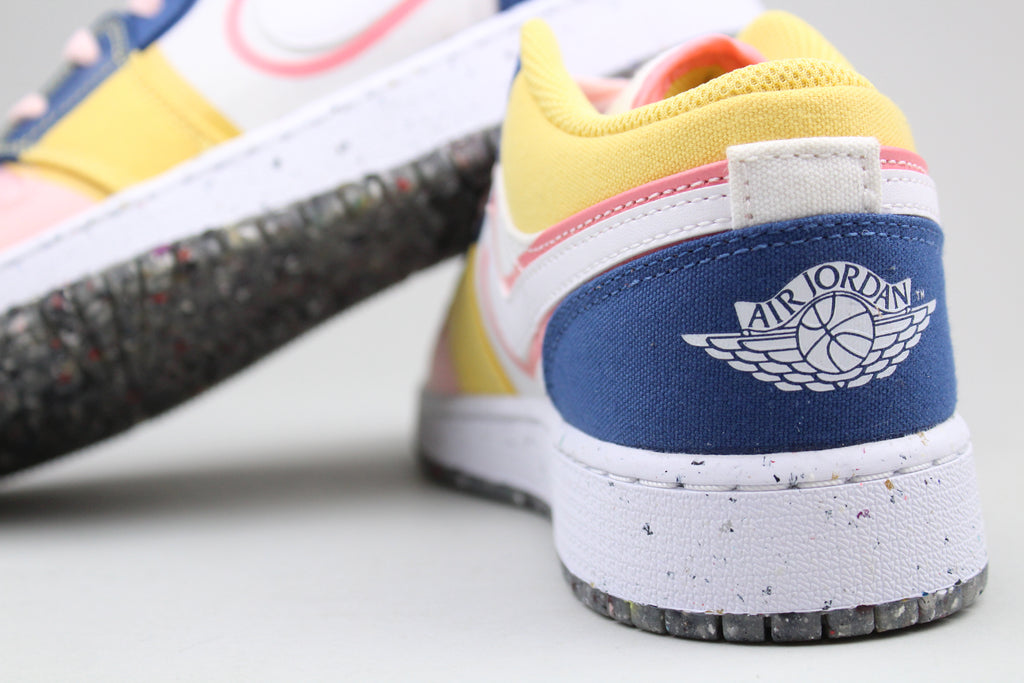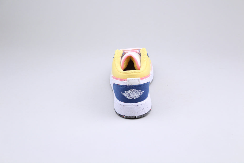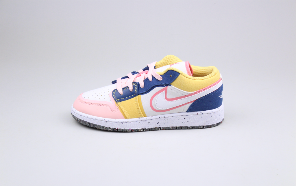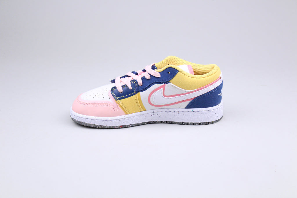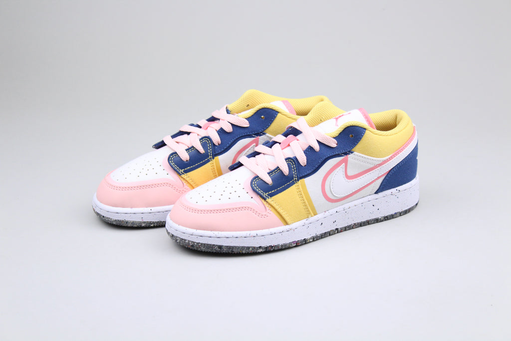 De Air Jordan 1 Low SE GS 'Canvas' is een levendige sneaker geschikt voor zowel jongens als meisjes. Het bovenwerk van de sneaker is opgebouwd uit twee verschillende materialen in diverse kleuren. Deze Air Jordan 1 heeft een witte lederen toebox en een zachtroze neus. De rest van de sneaker is gemaakt van duurzaam canvas, met gele en blauwe overlays voor een speels tintje. De witte Swoosh is roze omlijnd en vormt een opvallend detail. Een gespikkelde witte tussenzool en een grijze Nike Grind rubberen buitenzool maken de look van deze sneakers compleet.