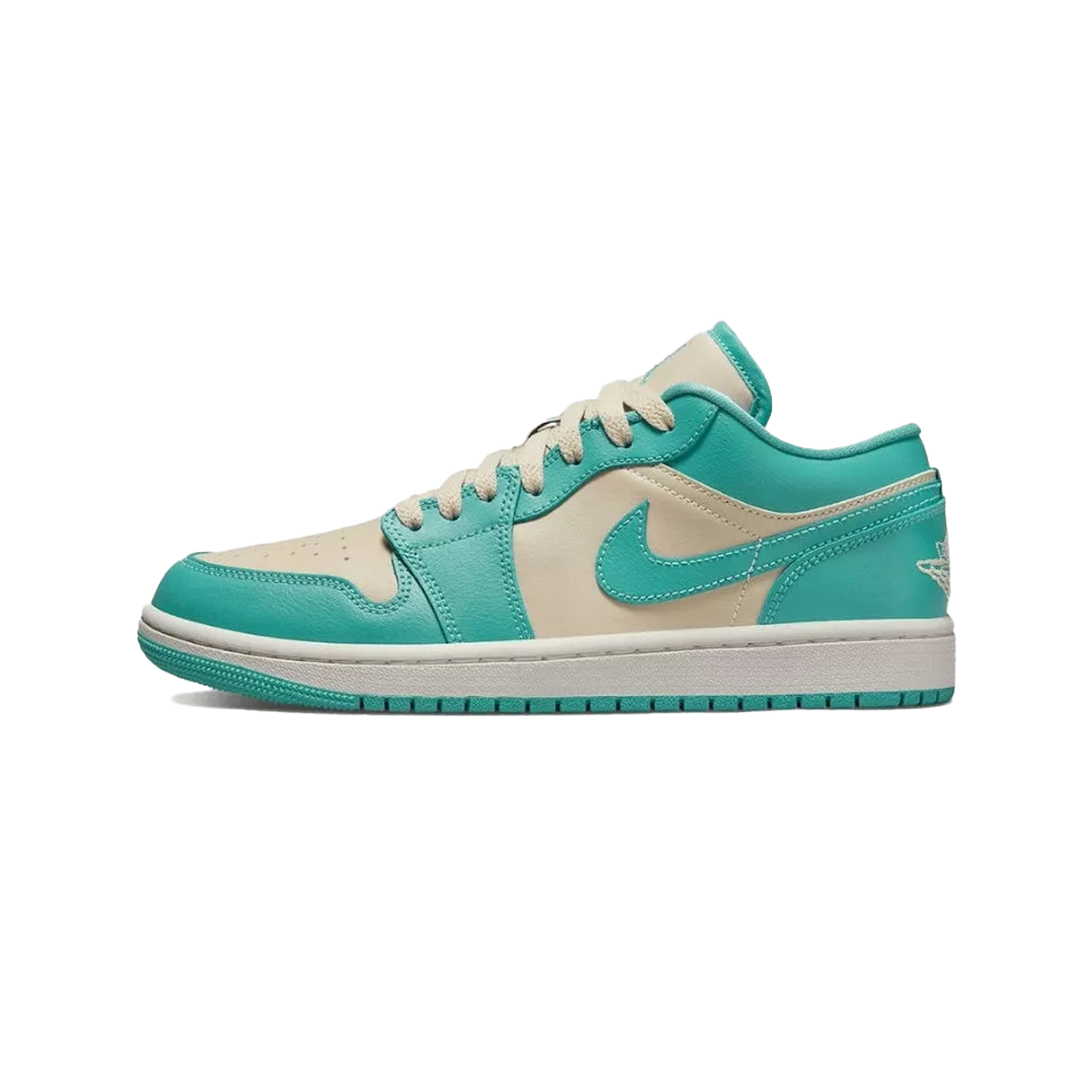 De neutraal beige leren basis van de Air Jordan 1 Low Tropical Teal dient als basis voor deze volledig leren sneaker, die ook is voorzien van bijpassende tongen, veters en het Wings-embleem op de achterkant. De leren overlay, schoenvoering, tong, binnenzool, swoosh en buitenzoolmarkering staan allemaal in contrast met groenblauw. Het geheel is afgewerkt met een witte tussenzool.