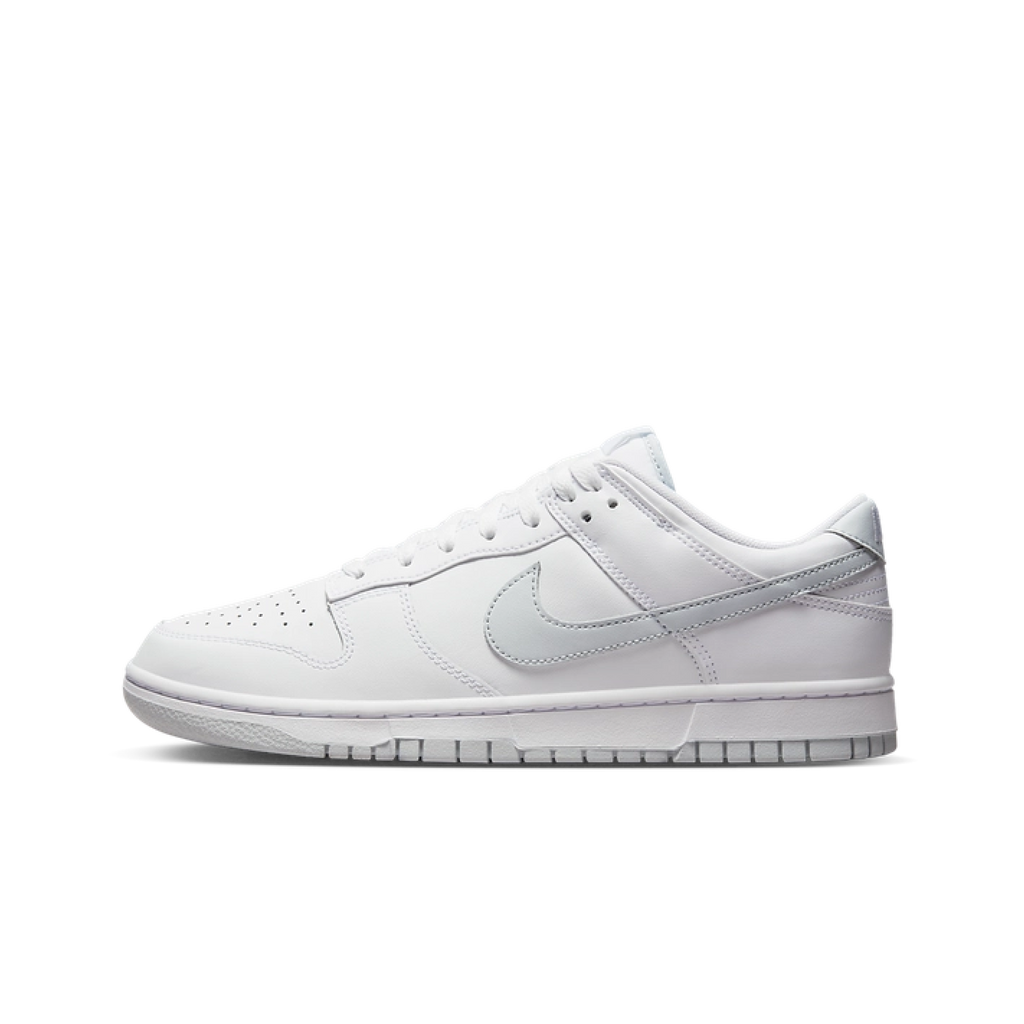 Deze lage sneakers bieden een tijdloze aantrekkingskracht met een gedurfde en eenvoudige esthetiek. In dit model worden leer, synthetische materialen en suède overlays gecombineerd voor duurzaamheid en stijl. De Nike Dunk Low in "Pure Platinum" heeft een tweekleurig ontwerp met een grijze buitenzool, swoosh en hak. De overige elementen zijn wit.