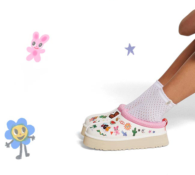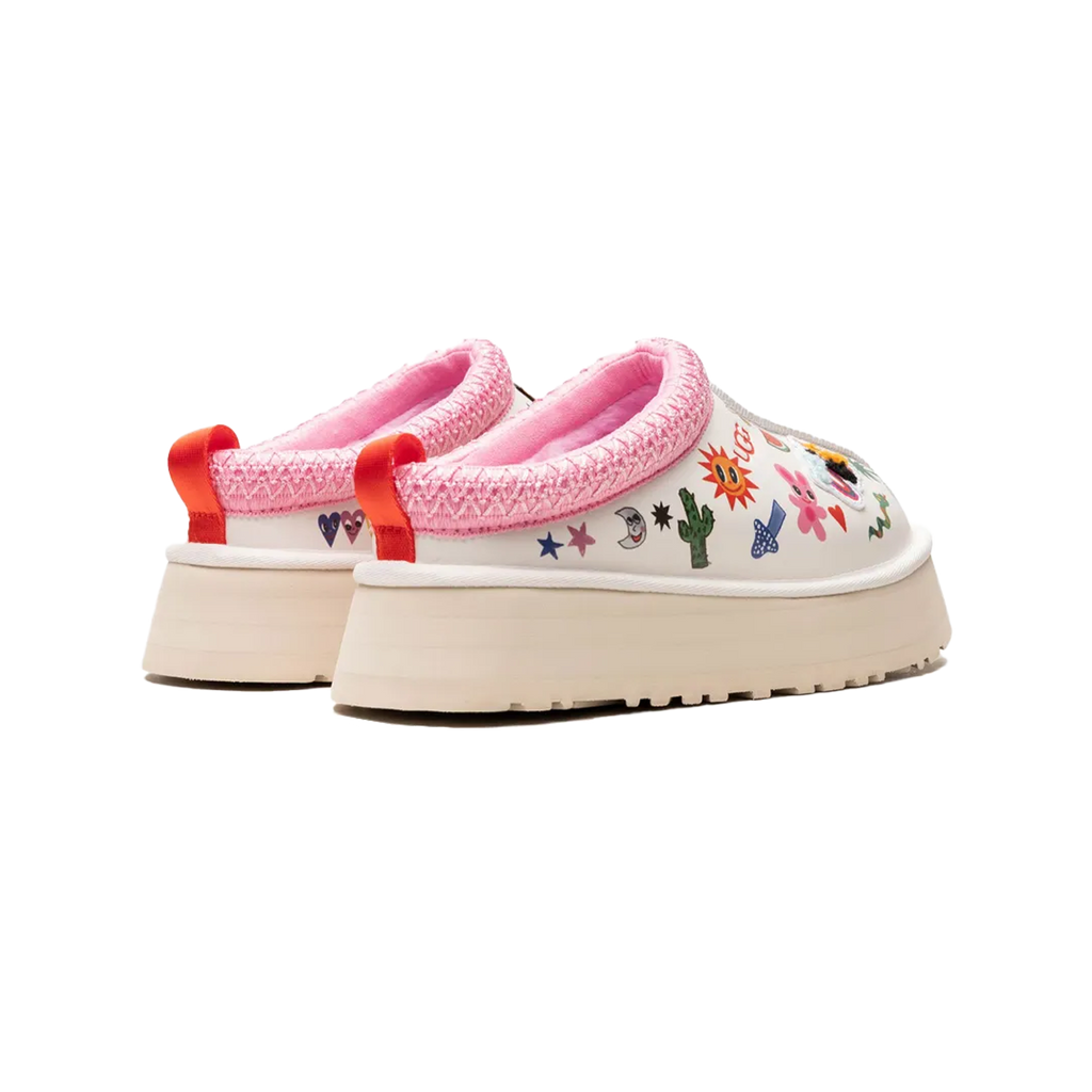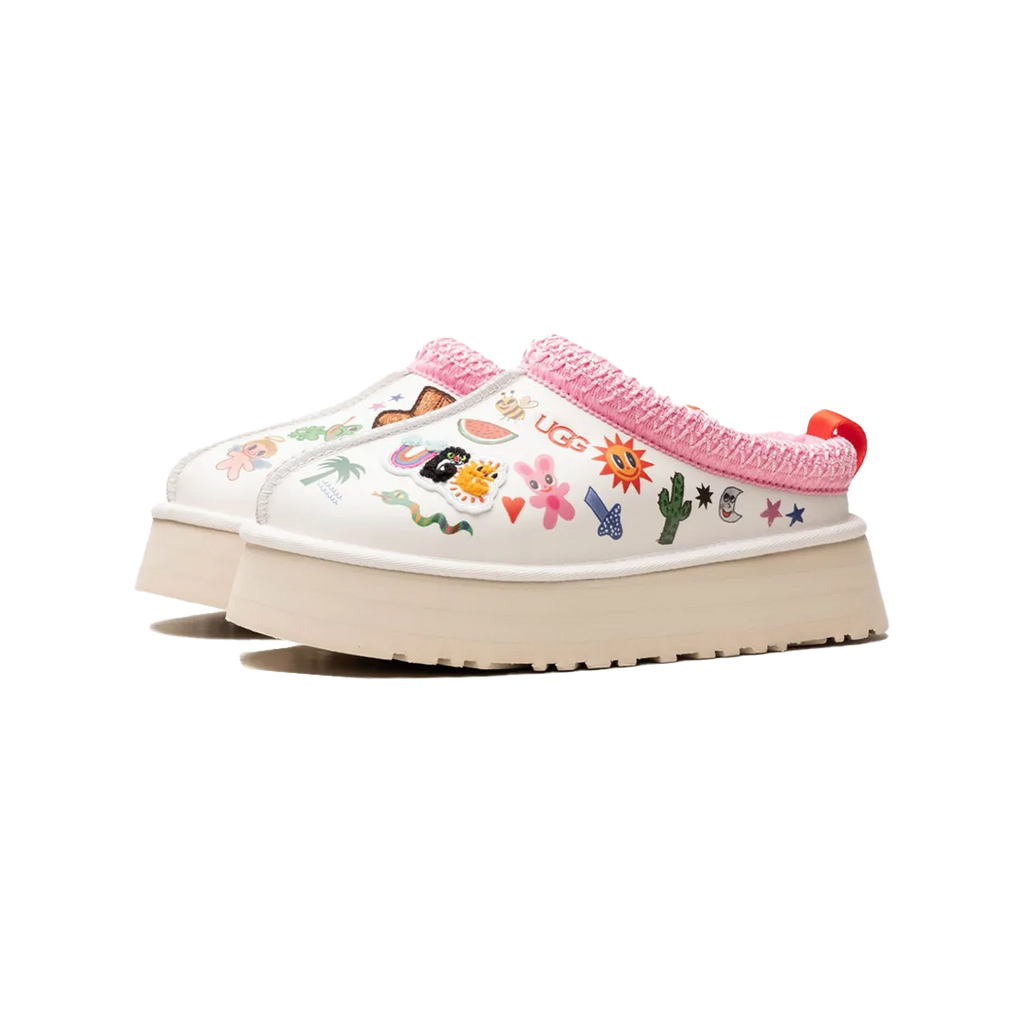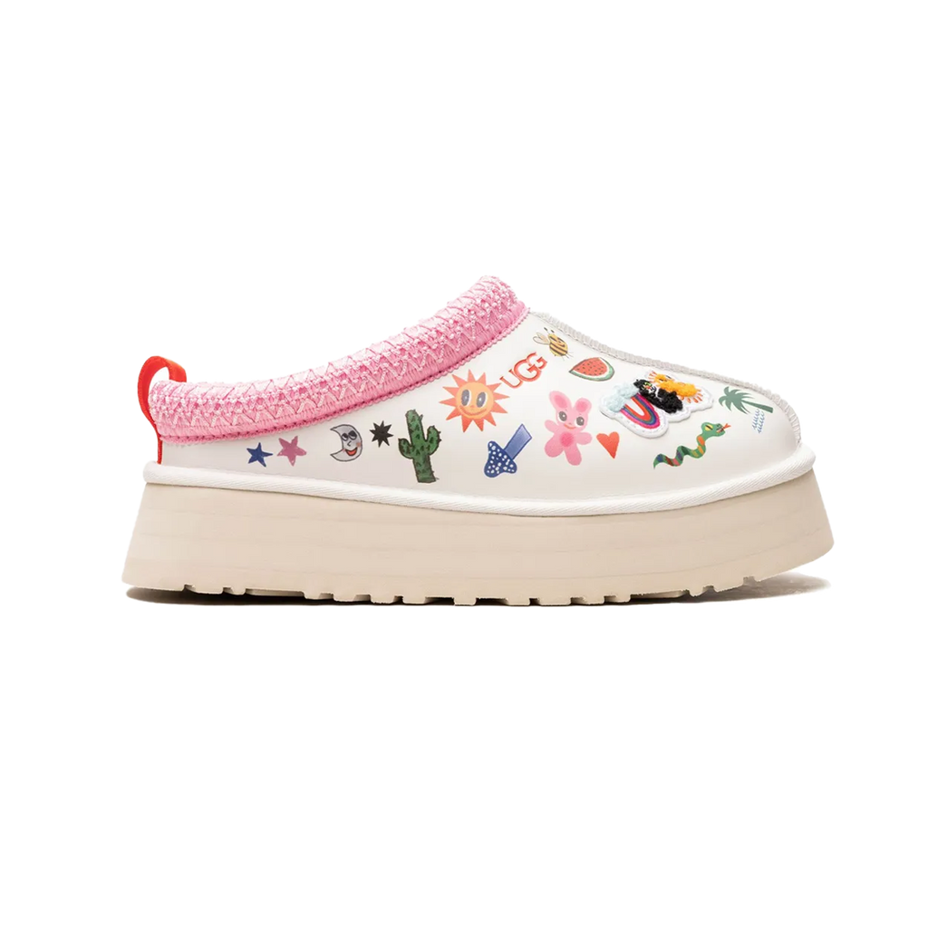 De UGG Tazz Slipper Humberto Cruz Pop Sketch (style 1155751-WHT) verandert de iconische Tazz-silhouet in een opvallend en verzamelwaardig kunststuk. Deze speciale editie, ontworpen in samenwerking met illustrator Humberto Cruz, bevat speelse handgetekende graphics op een helder wit suède bovenwerk en geeft de klassieke Tazz een unieke, creatieve uitstraling. De zachte UGGplush™ voering biedt warmte en comfort, terwijl de verhoogde 1.5-inch platformzool een moderne look toevoegt die perfect aansluit bij streetwear, casual outfits en artistieke styling. Lichtgewicht, warm en visueel bijzonder: deze limited edition is ideaal voor iedereen die een creatieve twist wil geven aan een UGG-klassieker.