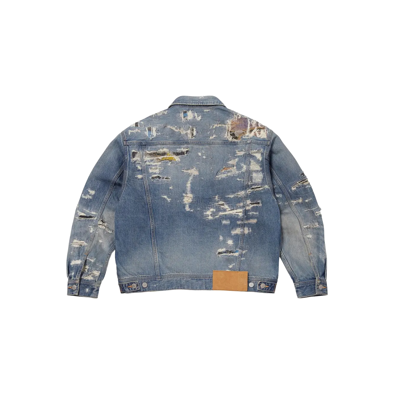 Supreme x MM6 Maison Margiela Distressed Selvedge Denim Trucker Jacket Blue reinterprets a timeless workwear silhouette through a conceptual design approach. Crafted from premium selvedge denim, this trucker jacket features a distressed finish that adds texture and depth to the classic blue base. The structured fit is combined with subtle deconstruction elements, reflecting MM6 Maison Margiela’s signature aesthetic. Co branding details complete the design, blending heritage craftsmanship with modern streetwear energy.