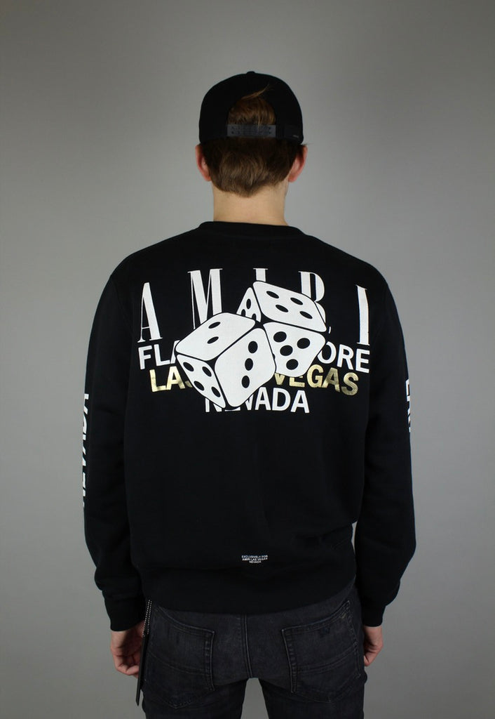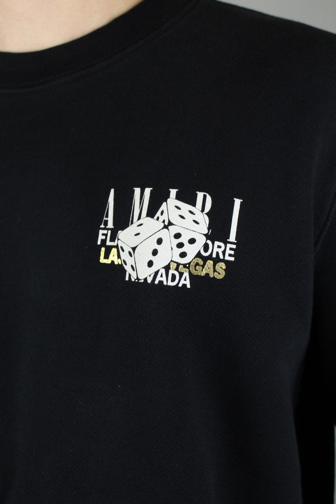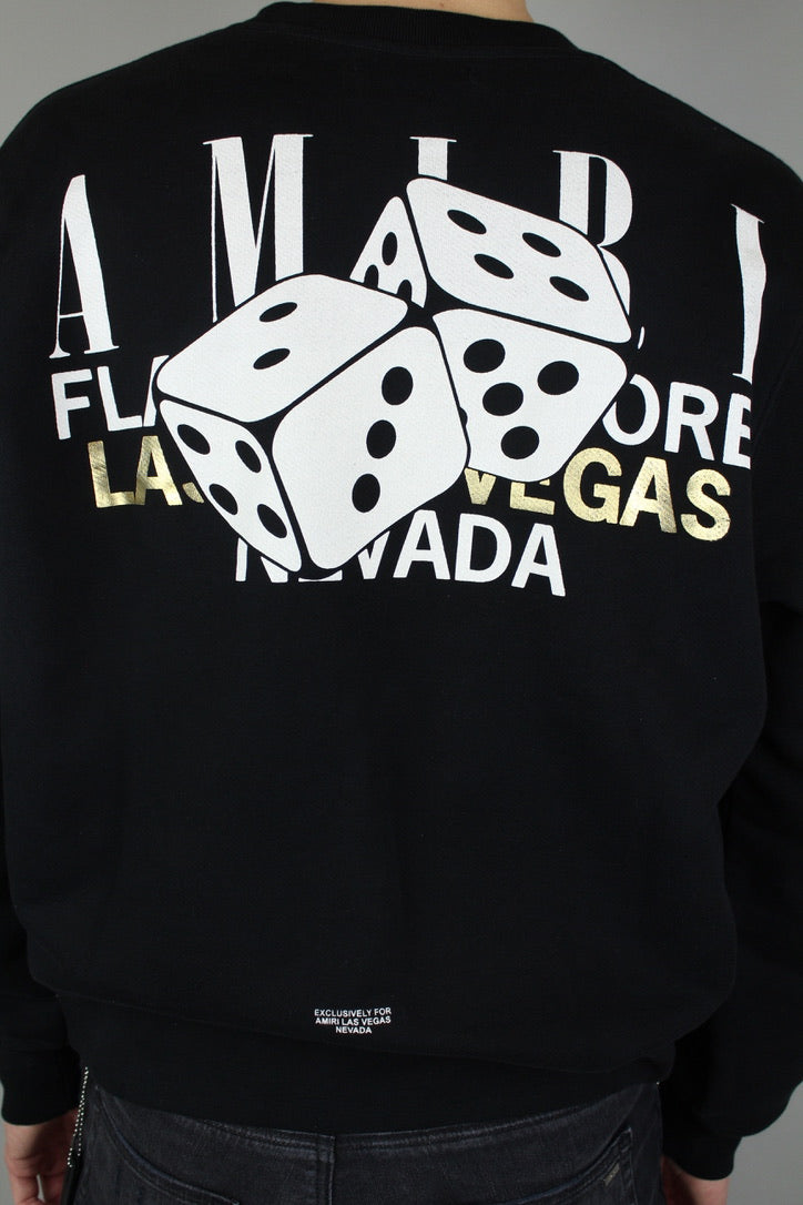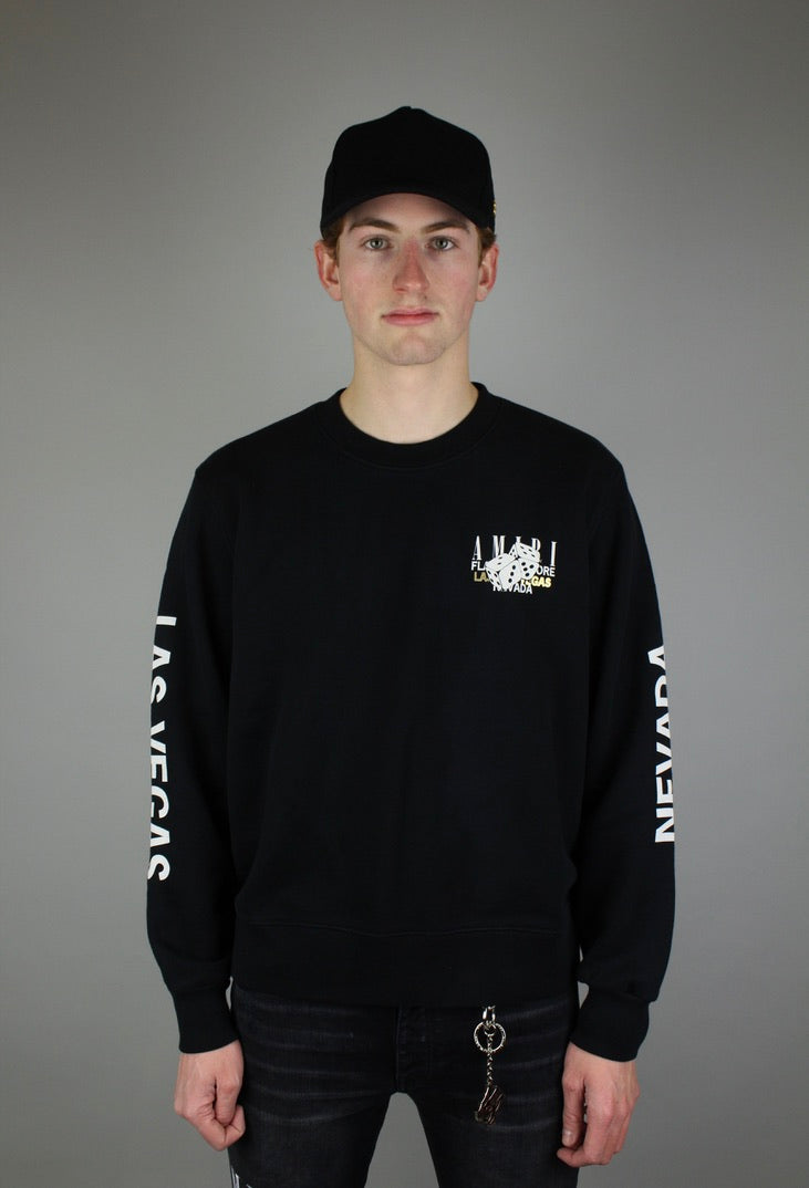 The timeless black color provides versatility, effortlessly complementing a variety of outfits. Featuring exclusive branding that celebrates the vibrant spirit of Las Vegas, this crewneck showcases Amiri's unique artistic vision and commitment to individuality. The distinctive design details reflect a contemporary flair that elevates the classic crewneck silhouette.