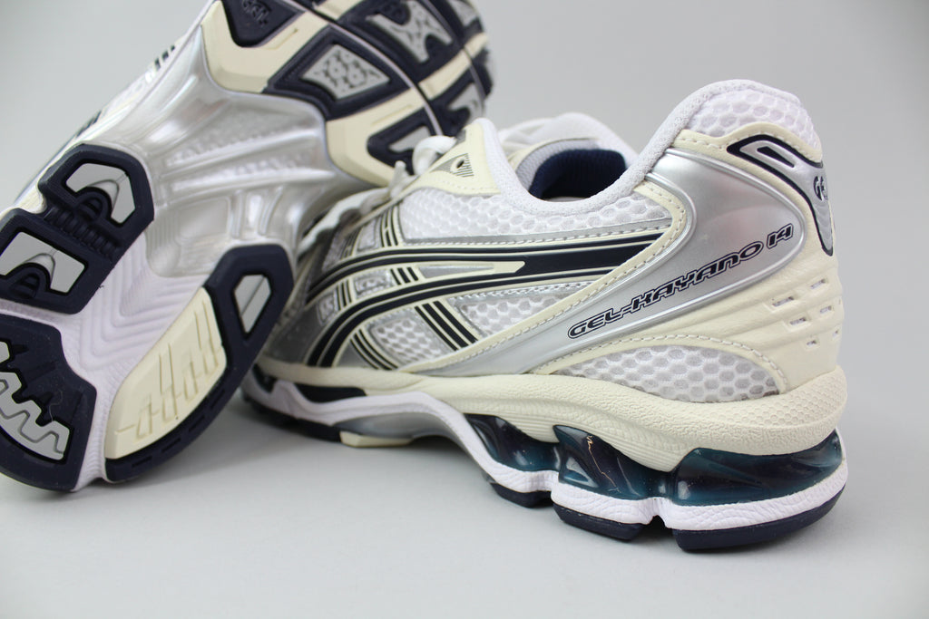 The ASICS Gel-Kayano 14 'White/Midnight' sneakers are a perfect blend of style, comfort, and performance, designed for both casual wear and athletic pursuits. Featuring a crisp white upper accented with deep midnight blue details, these shoes present a sleek and modern aesthetic that stands out in any setting.