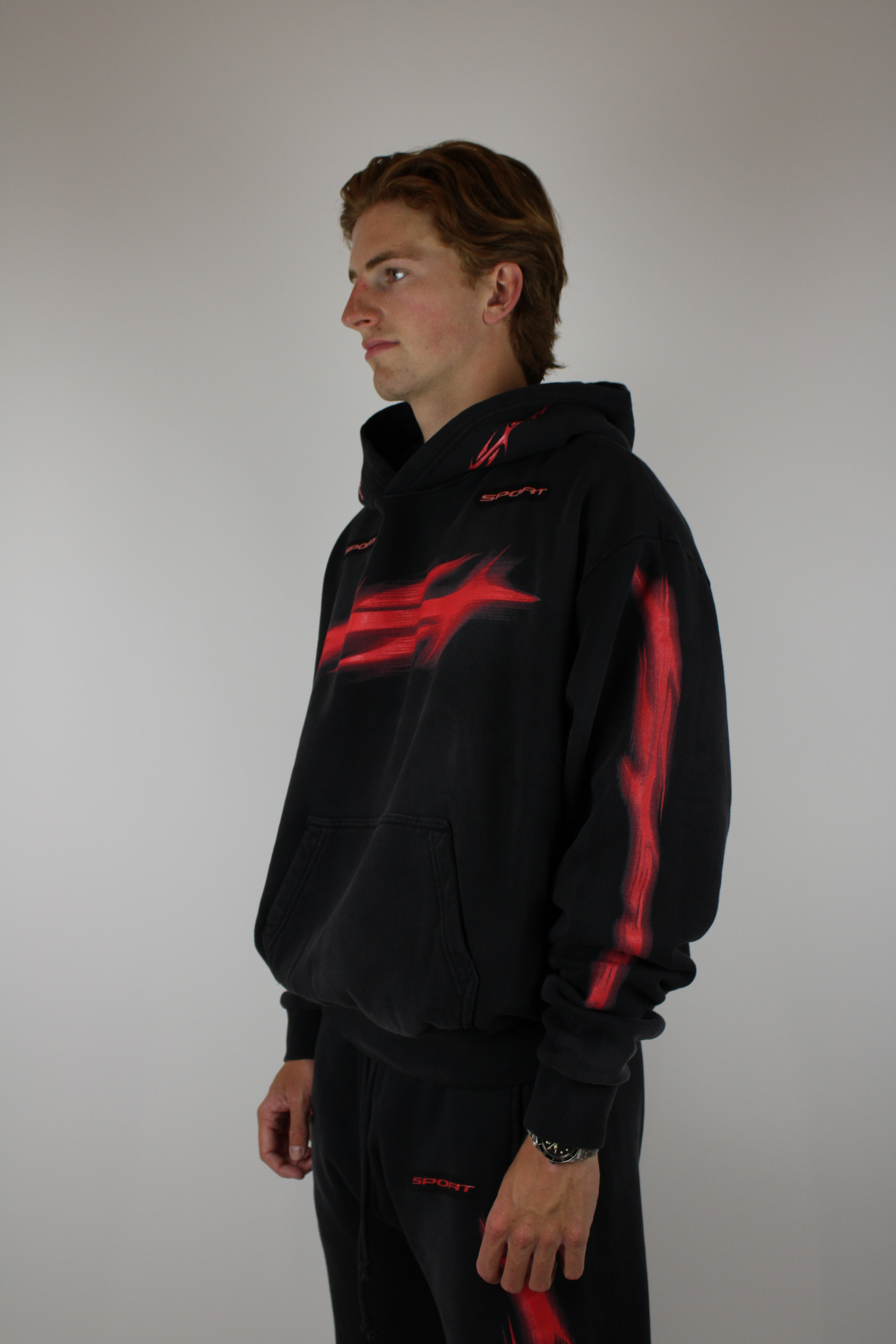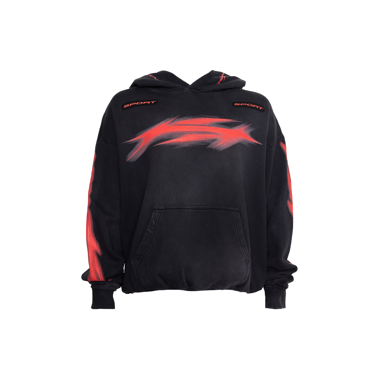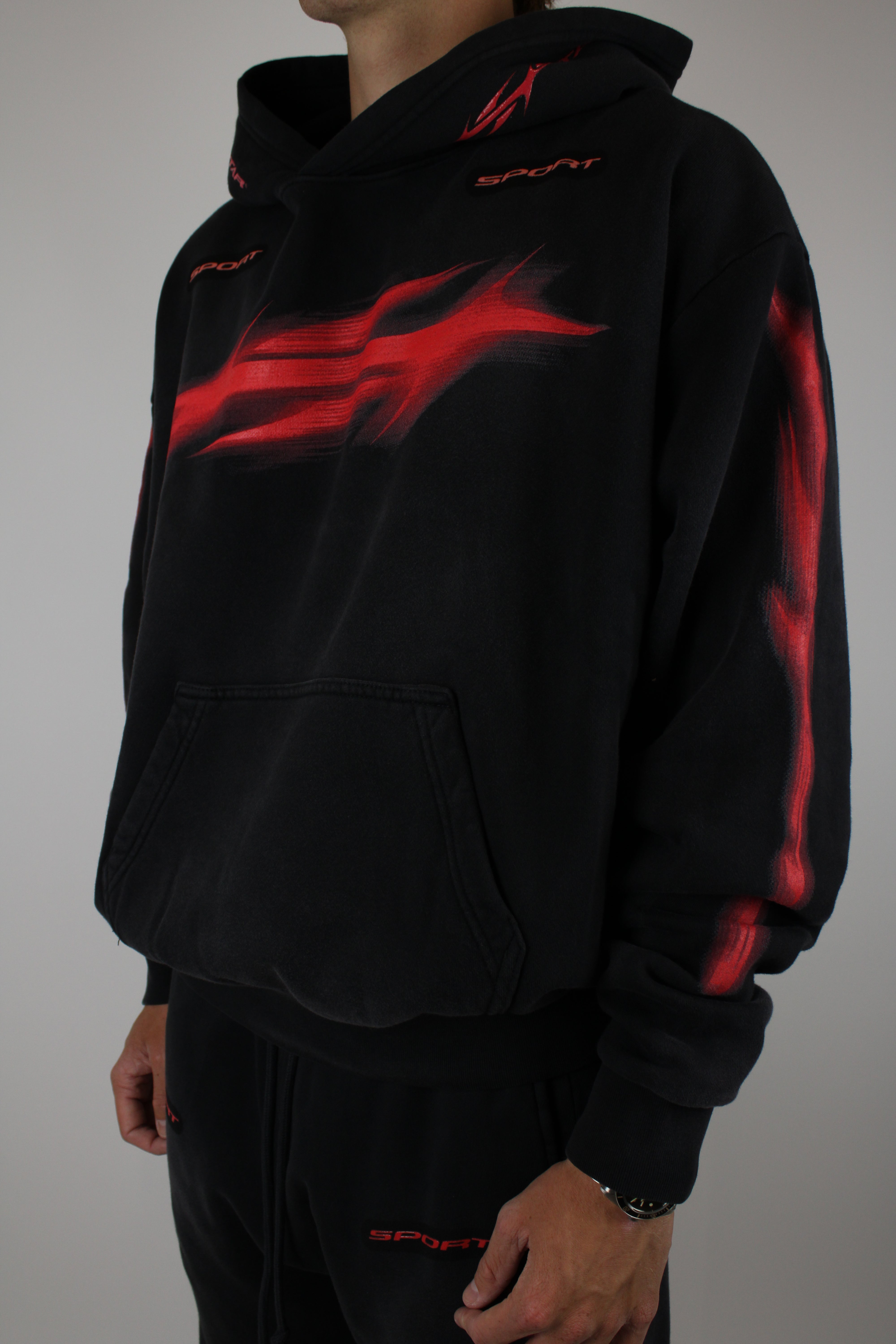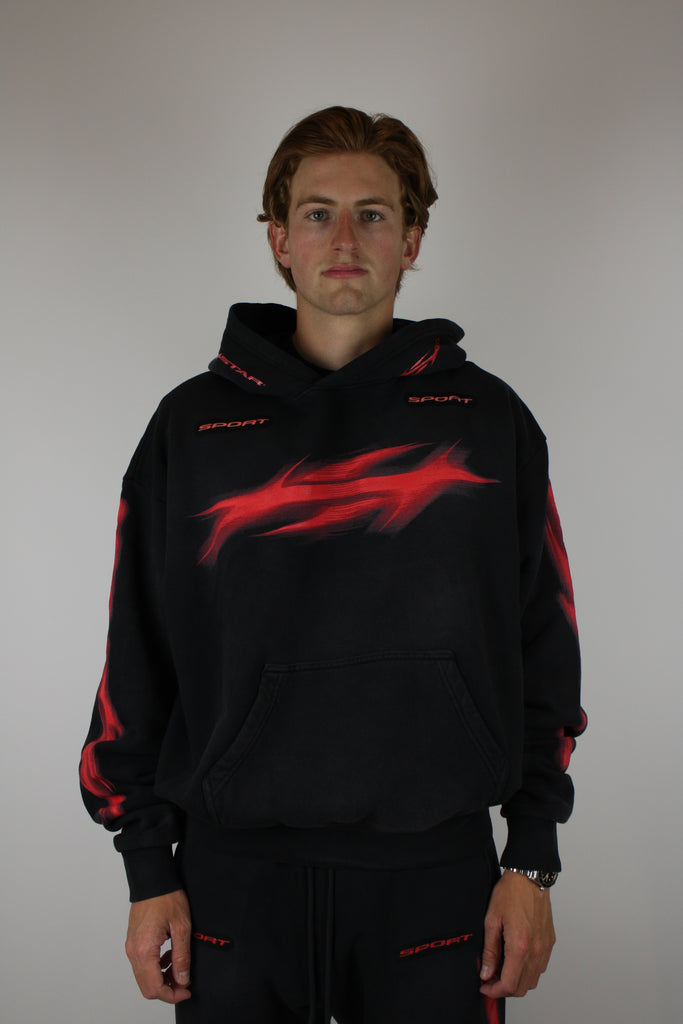 The standout feature? A high-energy motion blur flame graphic that wraps across the chest, sleeves, and hood, evoking a fast-paced, rebellious vibe. The vibrant red against deep black makes this hoodie pop, giving you a unique, street-style edge that embodies the Hellstar identity.