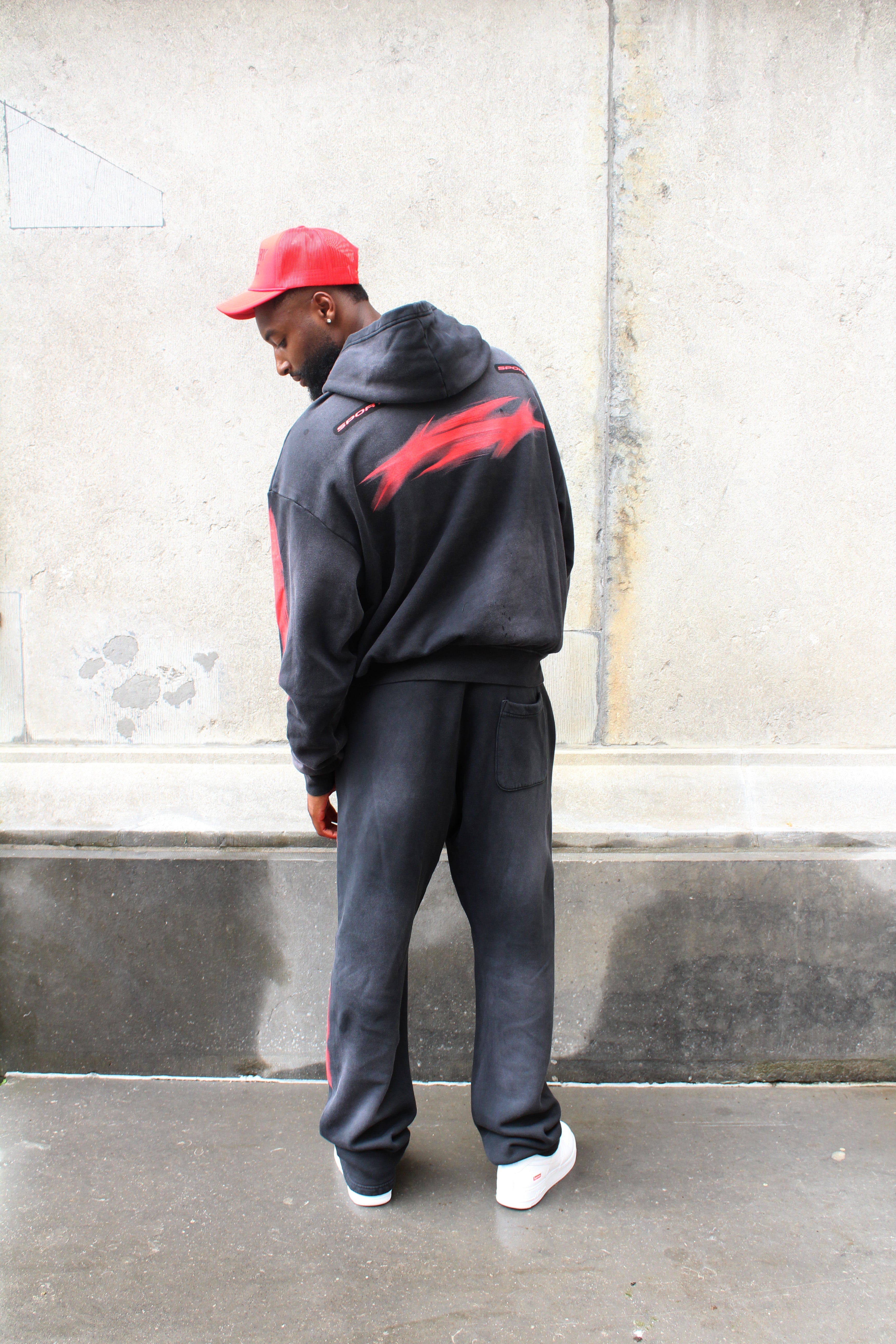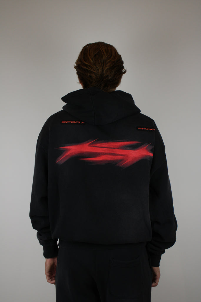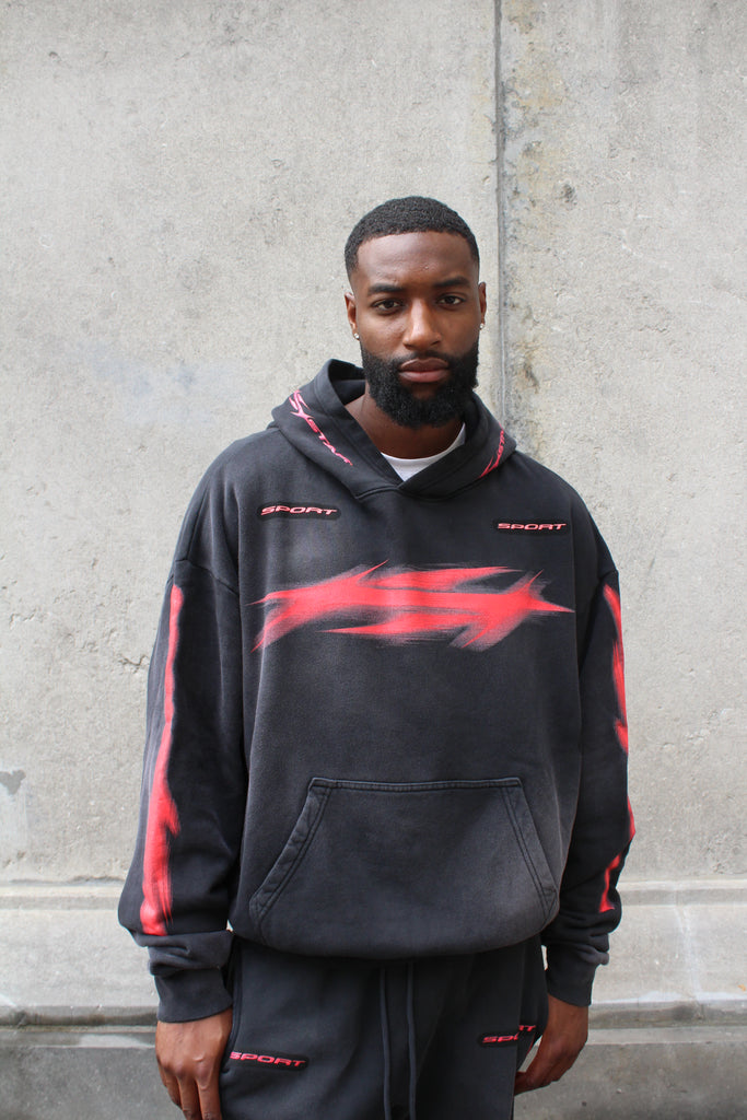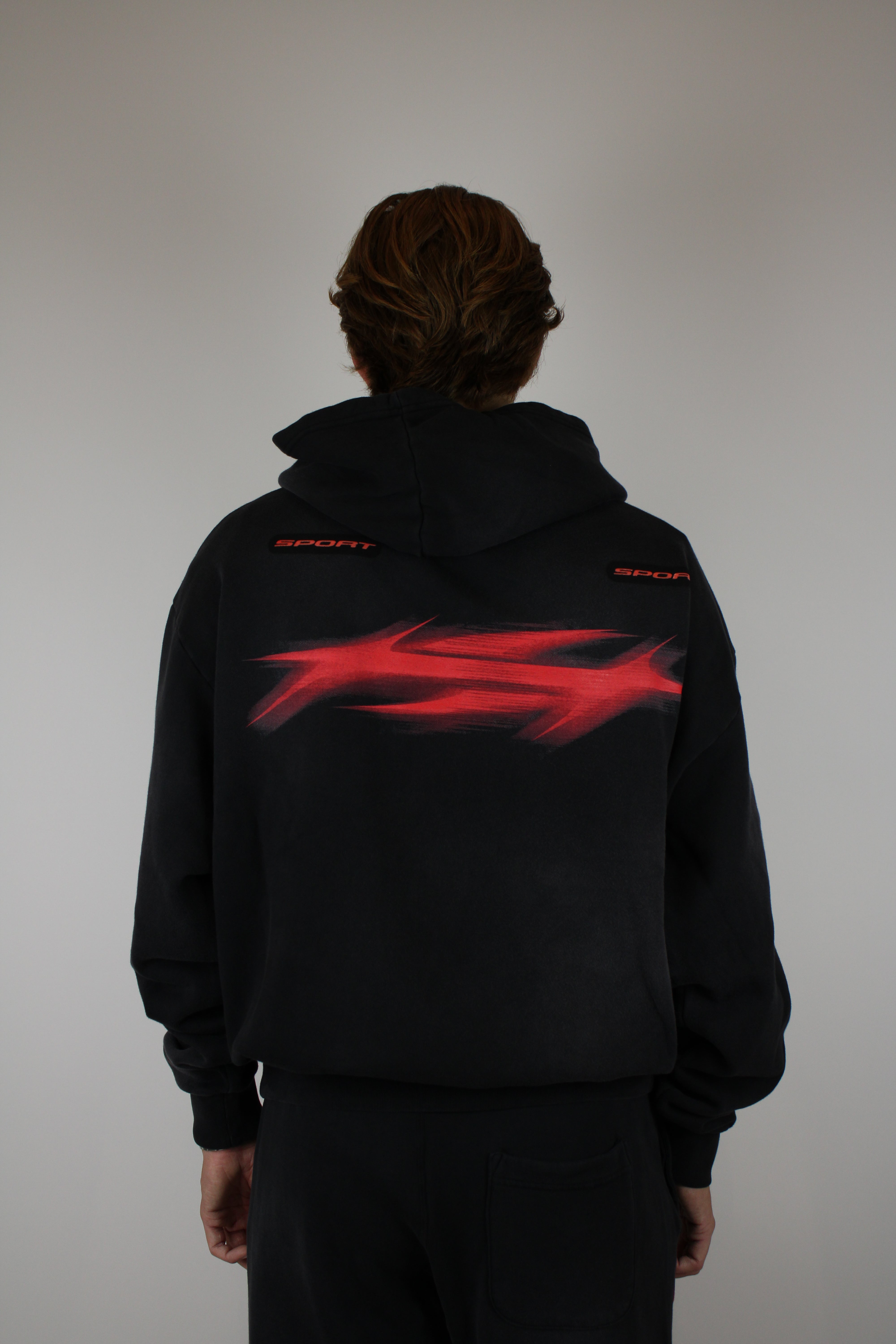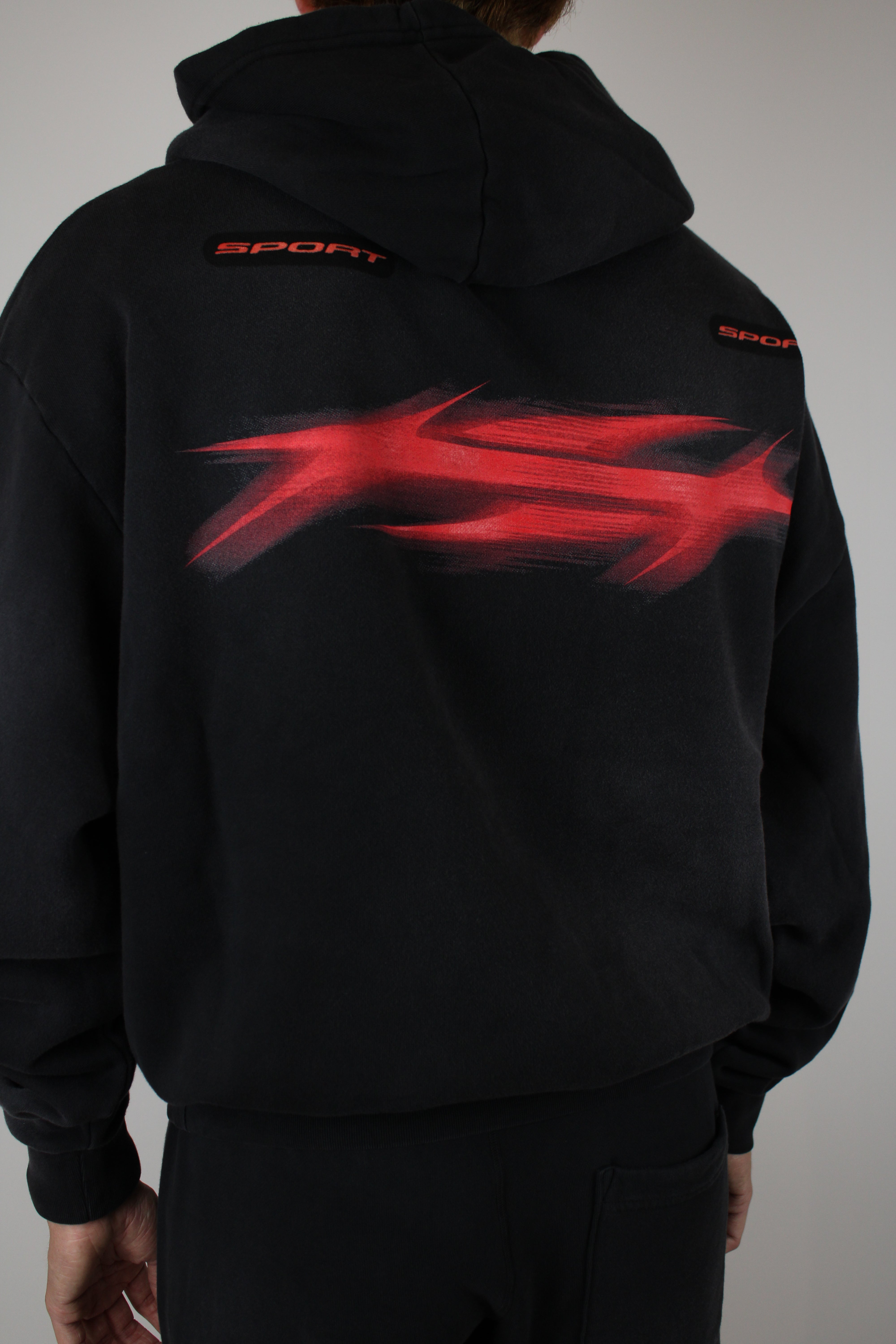 The standout feature? A high-energy motion blur flame graphic that wraps across the chest, sleeves, and hood, evoking a fast-paced, rebellious vibe. The vibrant red against deep black makes this hoodie pop, giving you a unique, street-style edge that embodies the Hellstar identity.