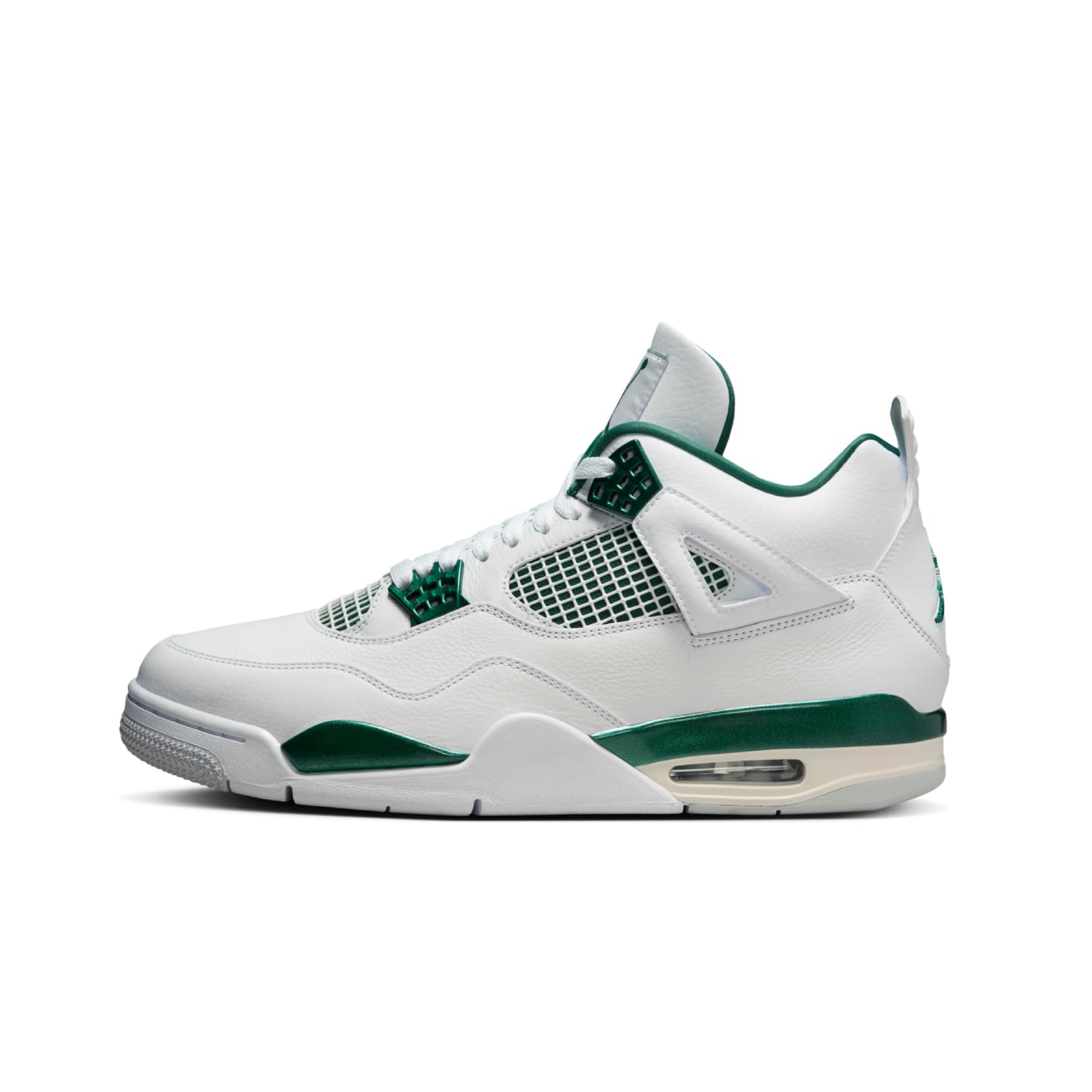 The "Oxidized Green" features a premium leather upper in a crisp white base, seamlessly accented with subtle touches of the signature oxidized green on the eyelets and heel tab. The contrasting black midsole and detailing add a layer of sophistication, making this sneaker a versatile addition to any wardrobe. The mesh underlays and netting on the sides not only provide breathability but also pay homage to the original design of the Jordan 4.