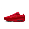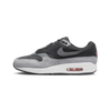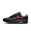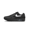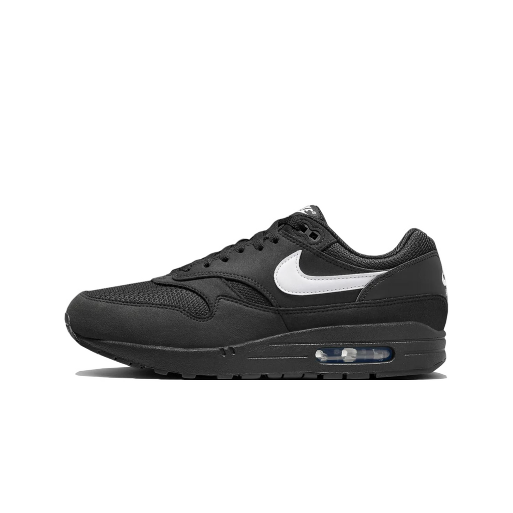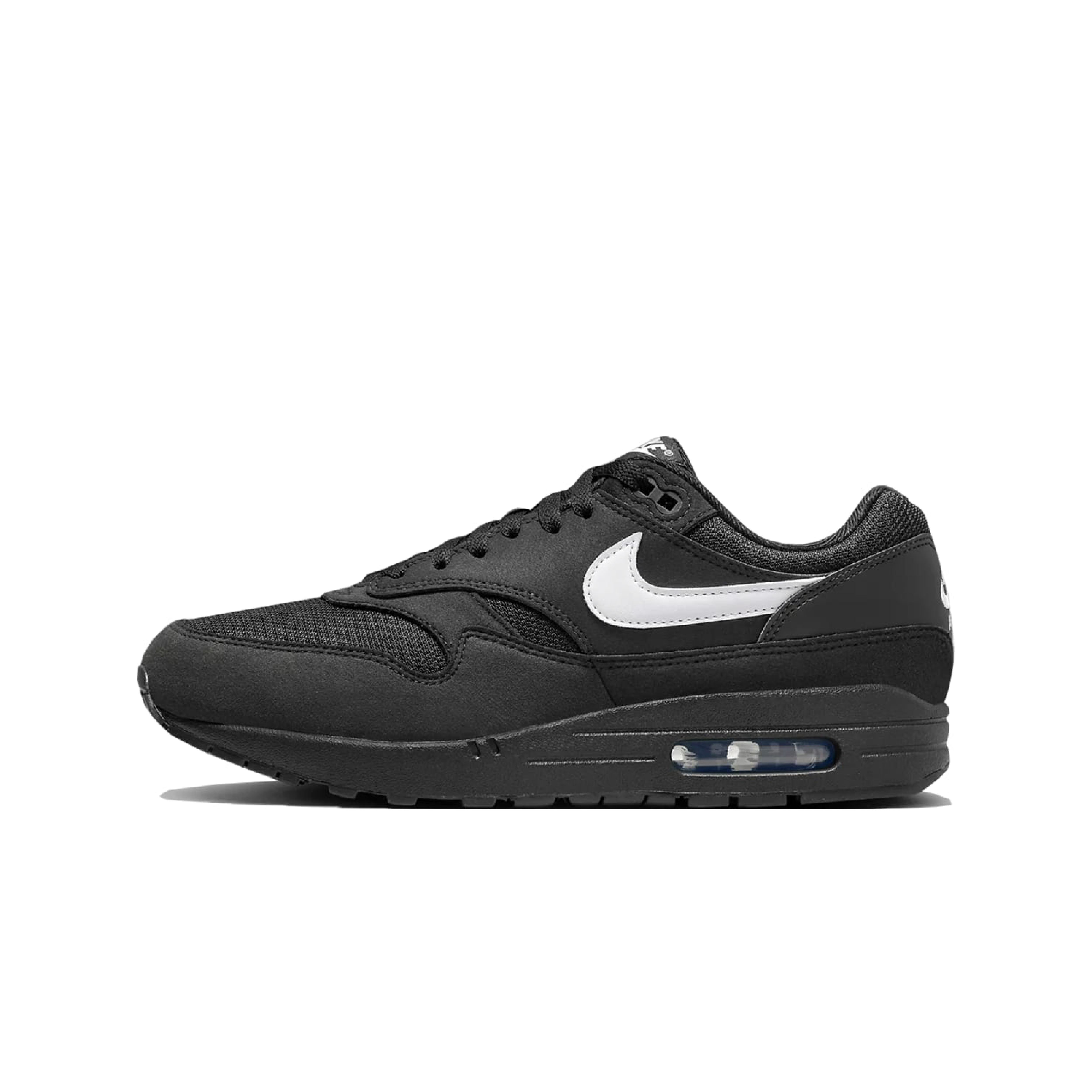 The striking black base is contrasted by white accents, including the iconic Swoosh, midsole, and branding details, creating a clean and sophisticated aesthetic that pairs effortlessly with any outfit. The classic silhouette retains the beloved features of the original Air Max 1, including the signature visible Air cushioning in the heel, which provides exceptional comfort and support for everyday wear.