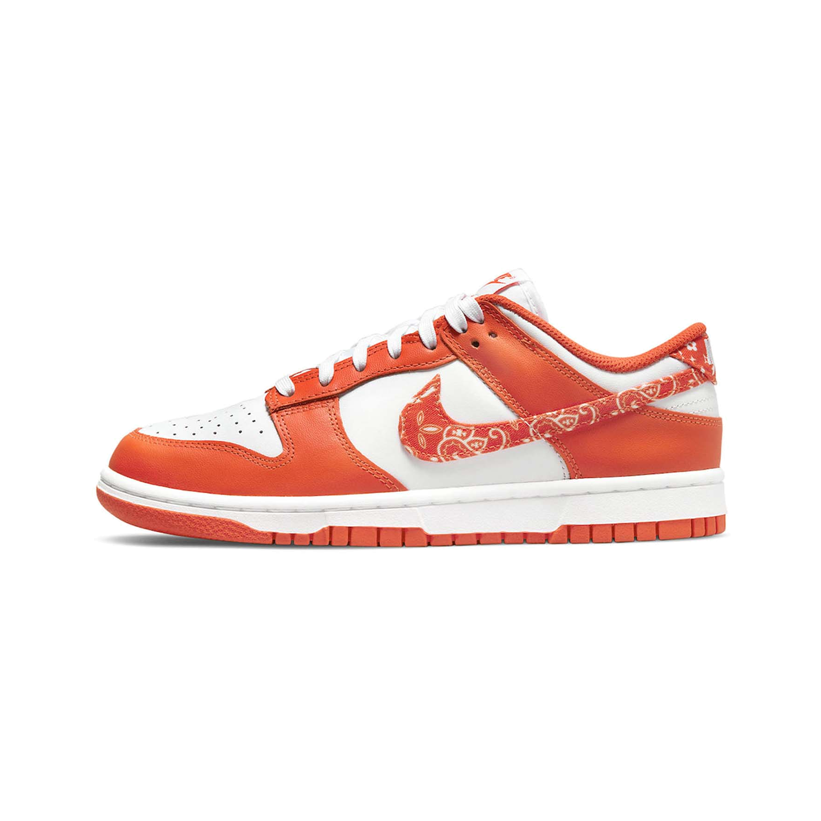 The Nike Dunk Low 'Paisley Orange' (Women's) brings a playful twist to a classic silhouette, merging vintage-inspired details with vibrant, modern energy. Featuring a smooth white leather base, this standout sneaker is accented with bold Orange overlays and a unique paisley-patterned Swoosh that adds a stylish, retro flair.